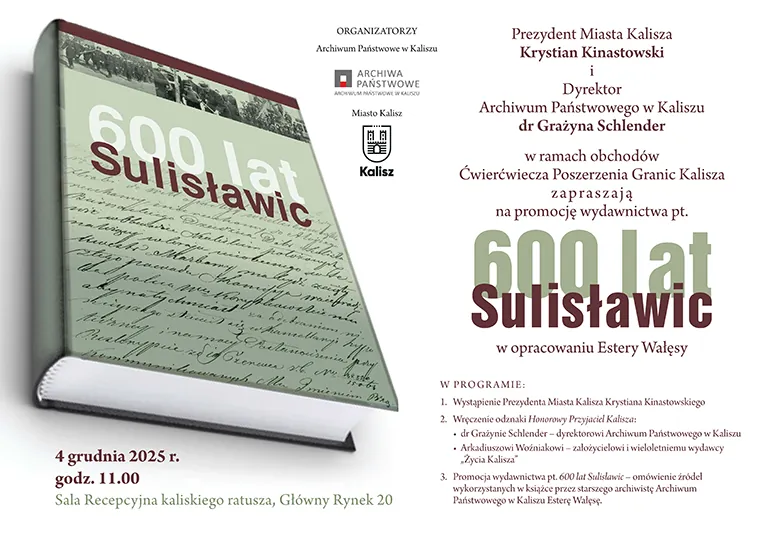 Serdecznie zapraszamy na promocję książki pt. 600 lat Sulisławic, w opracowaniu Estery Wałęsy, wydanej przez Archiwum Państwowe w Kaliszu w ramach obchodów Ćwierćwiecza Poszerzenia Granic Kalisza o sołectwa Dobrzec, Sulisławice i Sulisławice Kolonia. Spotkanie promocyjne odbędzie się 4 grudnia 2025 r., o godz. 11.00 w Sali Recepcyjnej kaliskiego ratusza.