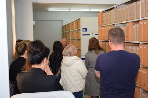 Między wykładami słuchacze zostali oprowadzeni po magazynach i pracowni konserwatorskiej, gdzie krótką prelekcję o profilaktyce i konserwacji akt wygłosiła Aneta Burchard.