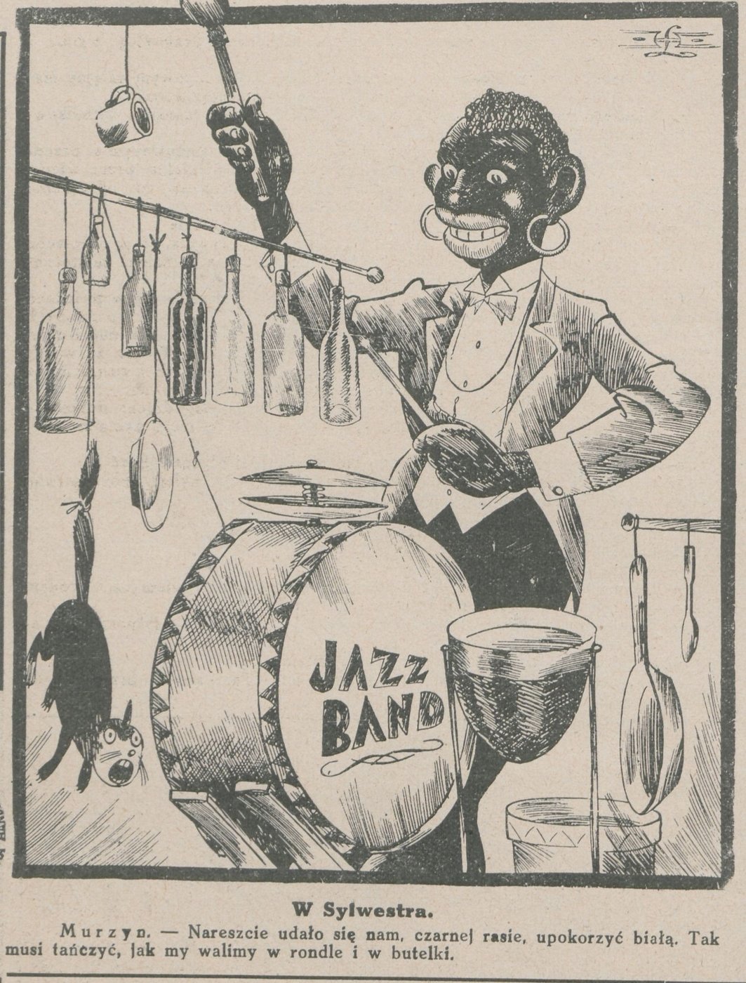Tak postrzegano jazz w 20-leciu międzywojennym - satyryczny rysunek pochodzi z czasopisma "Mucha".