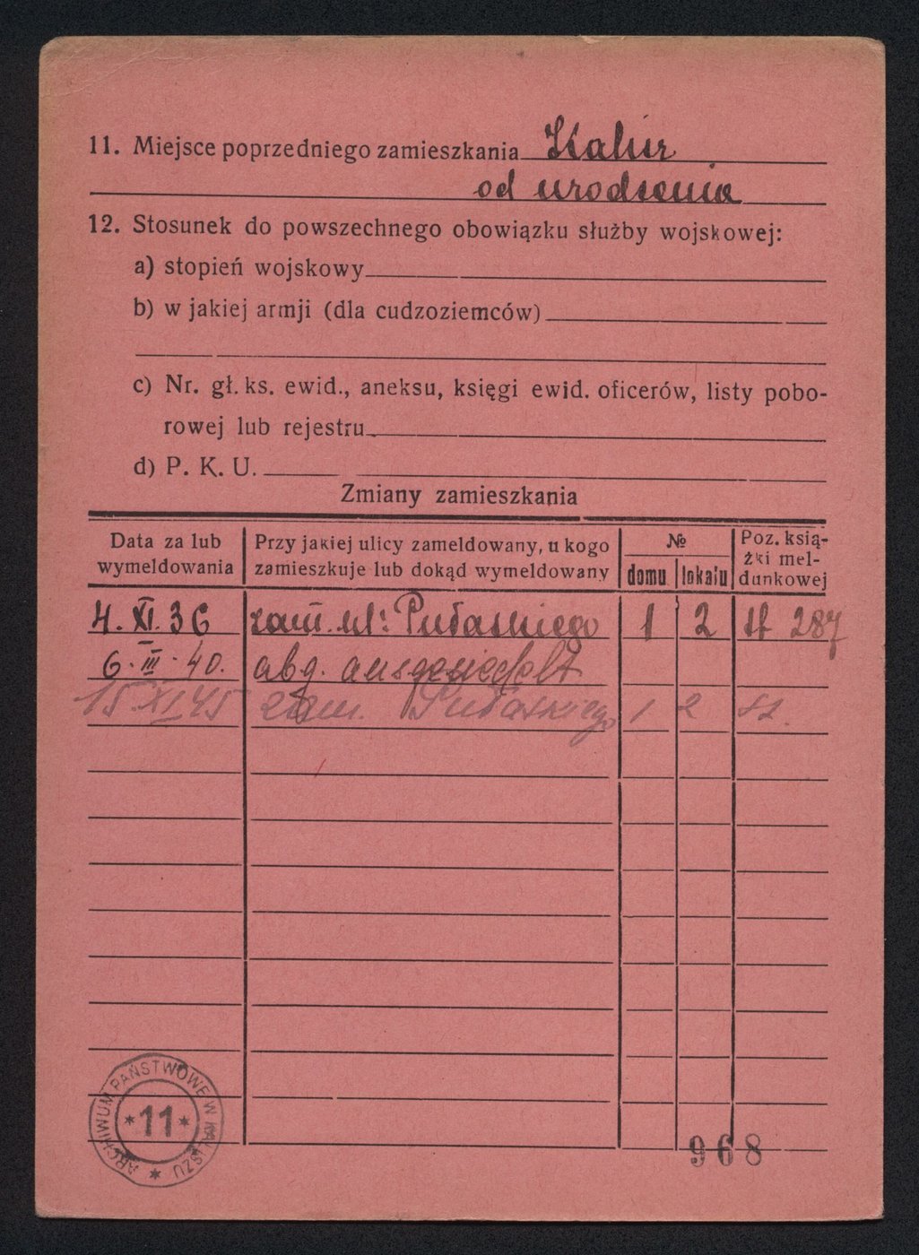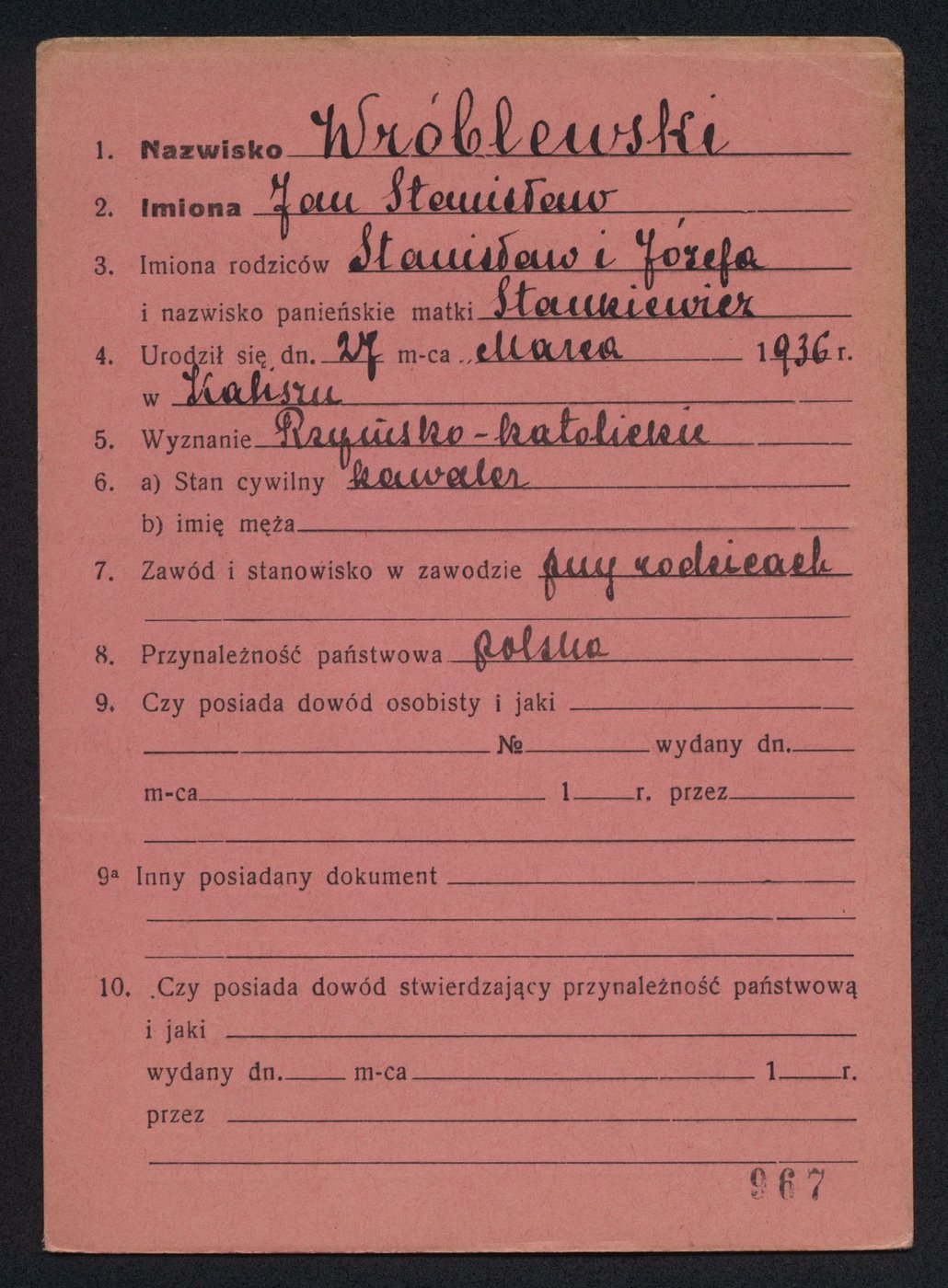 Karta meldunkowa indywidualna Jana "Ptaszyna" Wróblewskiego, który urodził się 27 marca 1936 r. w Kaliszu. Jego rodzicami byli Stanisław i Józefa Wróblewscy. Rodzina mieszkała przy ul. Pułaskiego 1 (róg Śródmiejskiej). W tym miejscu znajduje się neon upamiętniający miejsce zamieszkania kaliskiego jazzmana.
