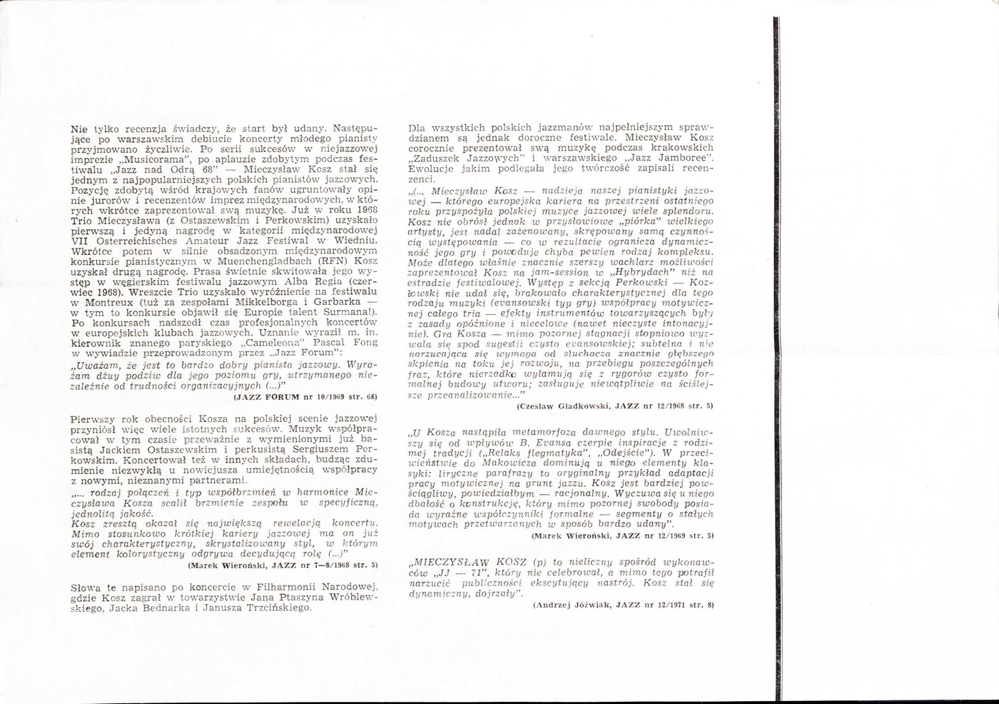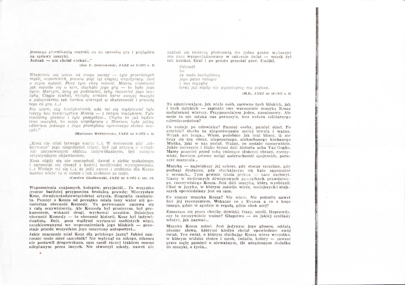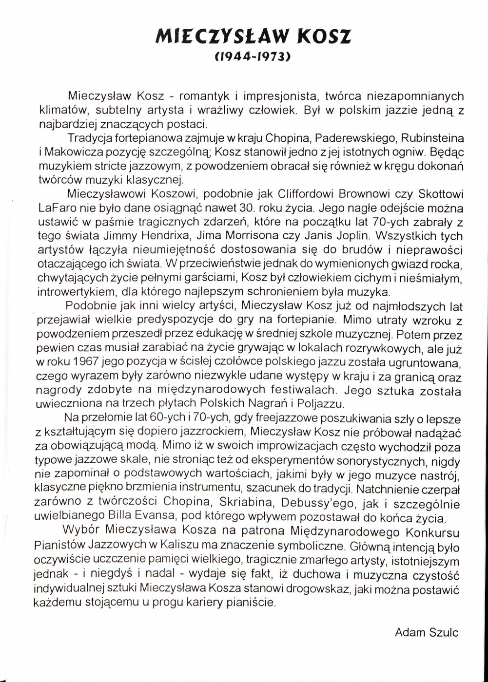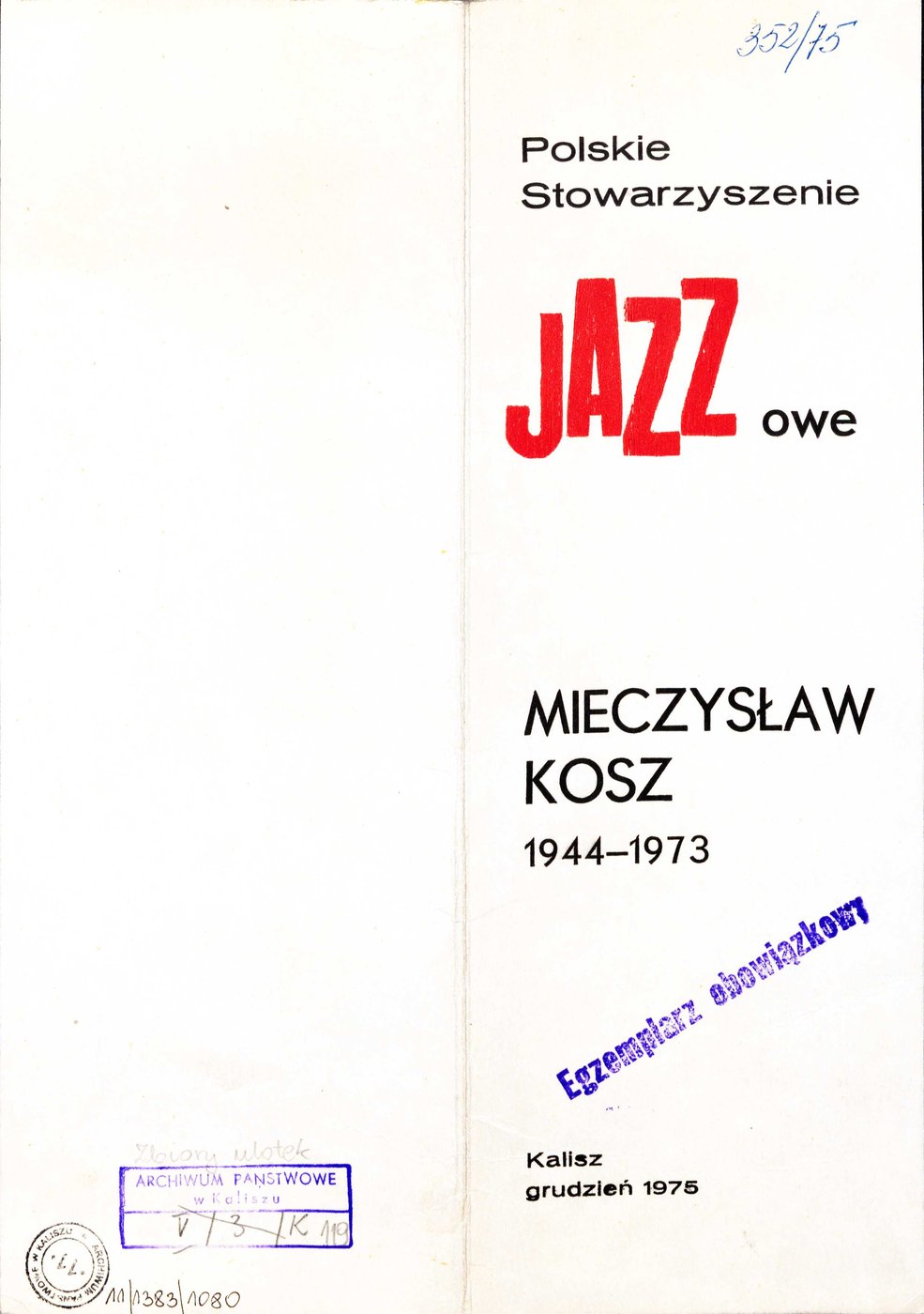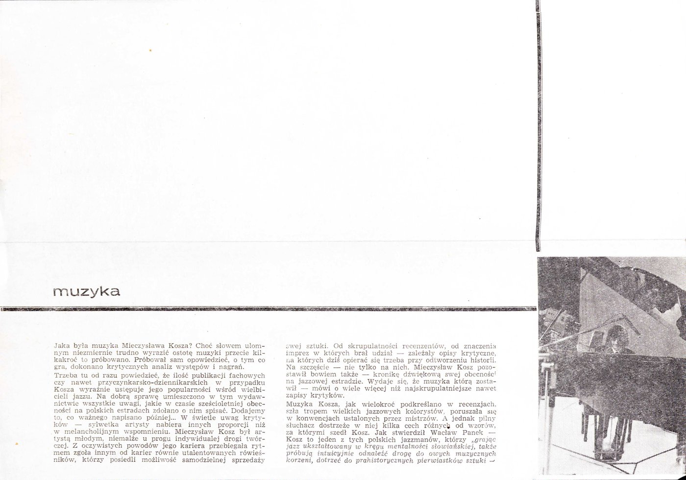 Broszura pt. Mieczysław Kosz 1944-1973, wydana przez Polskie Stowarzyszenie Jazzowe w Kaliszu w 1975 r. w okazji Międzynarodowego Festiwalu Pianistów Jazzowych im. Mieczysława Kosza.