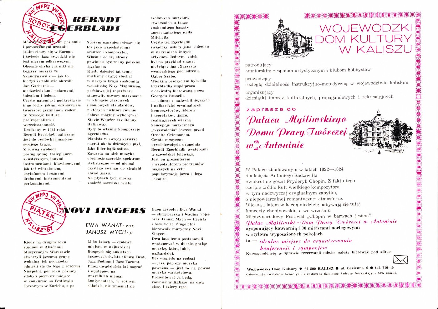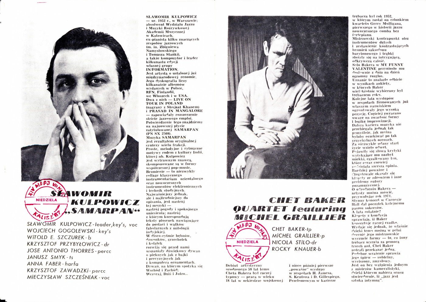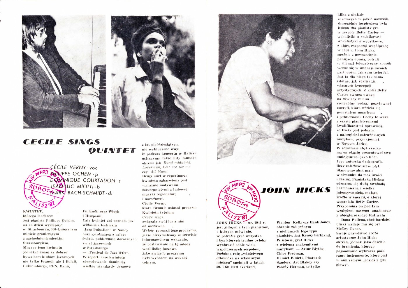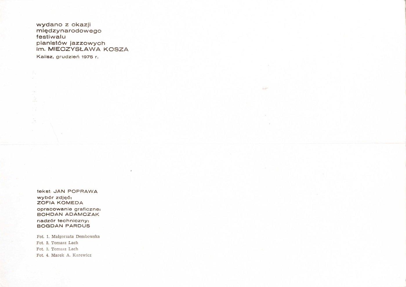 Broszura wydana z okazji zbliżającego się XIV Międzynarodowego Festiwalu Pianistów Jazzowych i VII Konkursu im. Mieczysława Kosza w 1987 r.