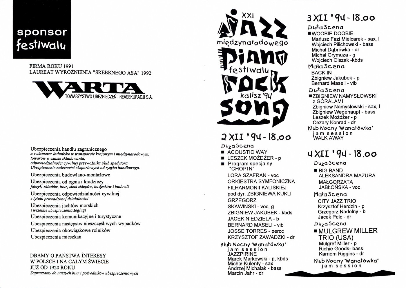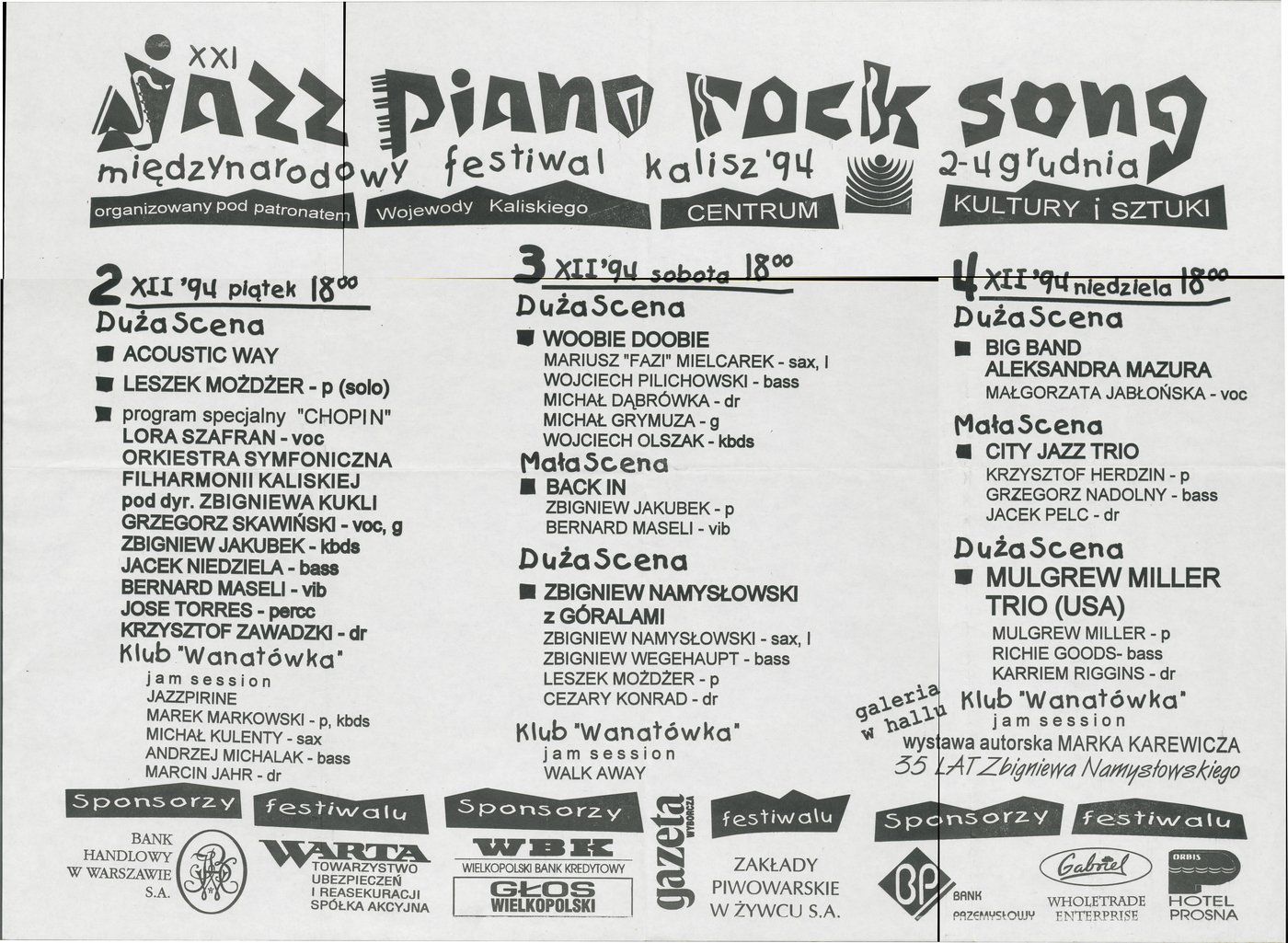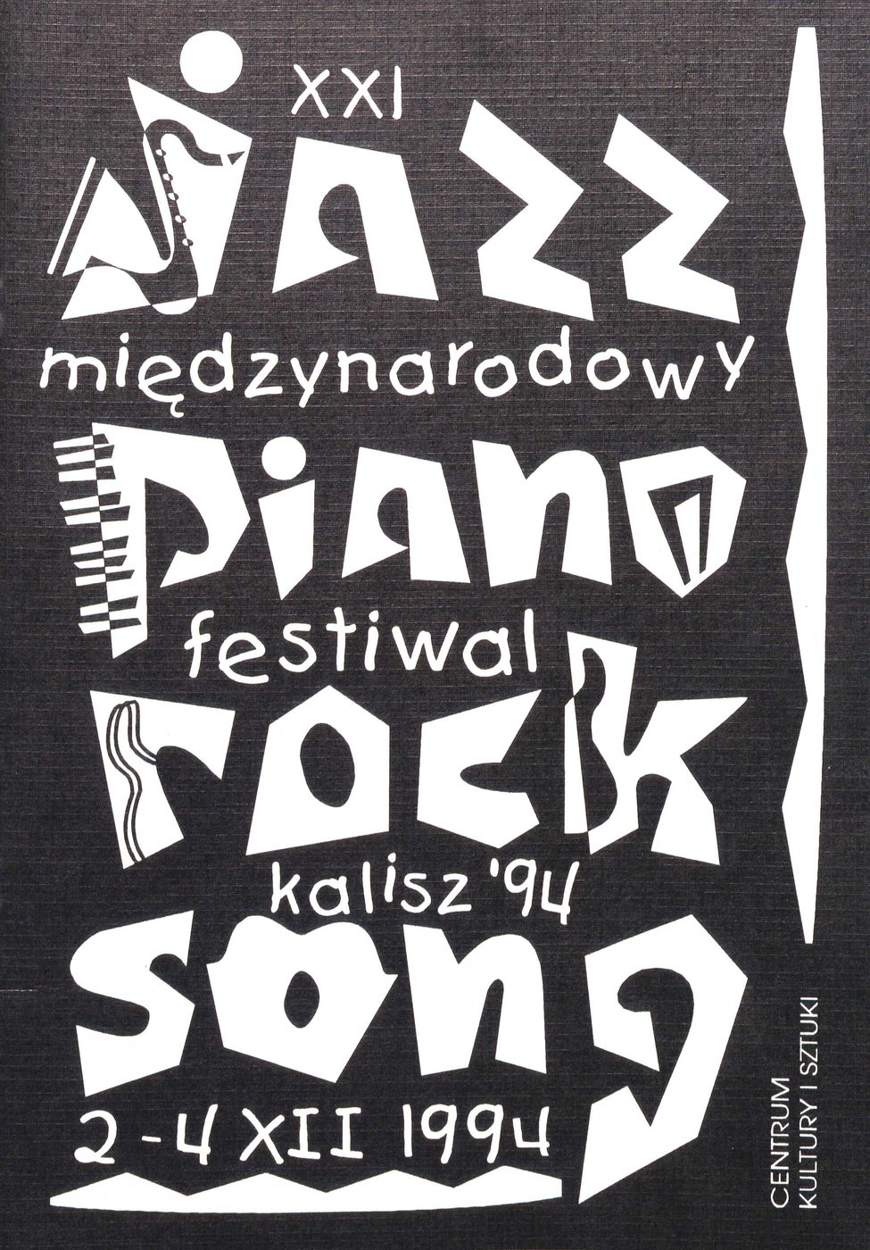 Plakat z programem XXI Międzynarodowego Festiwalu Jazz-Piano-Rock-Song w Kaliszu w 1994 r.