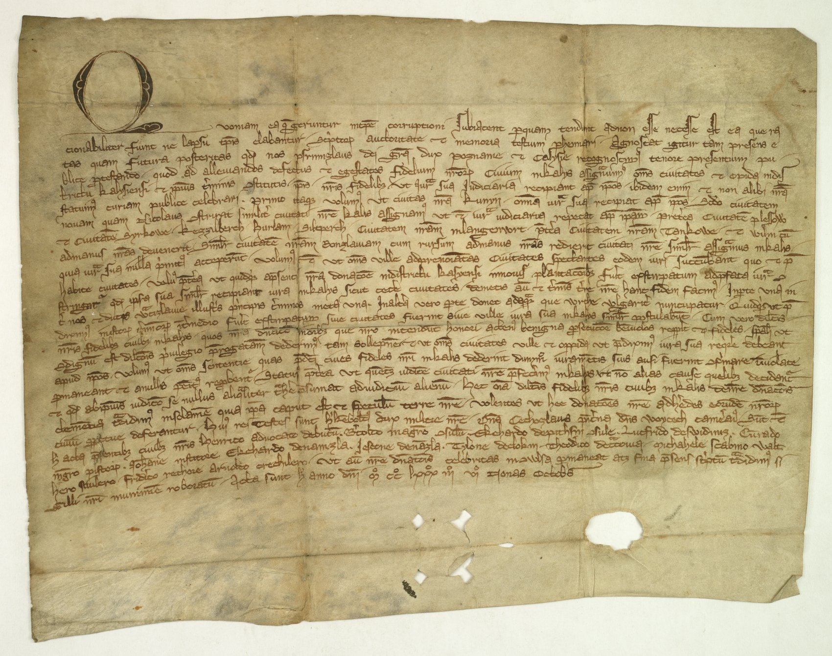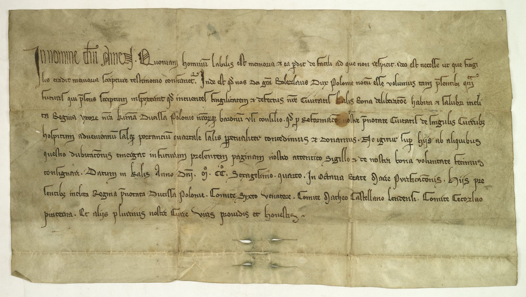 Dokument Bolesława Pobożnego z 1264 r. nadający Kaliszowi prawo poboru kwarty soli od każdego wozu kupieckiego wiozącego sól do Kalisza.