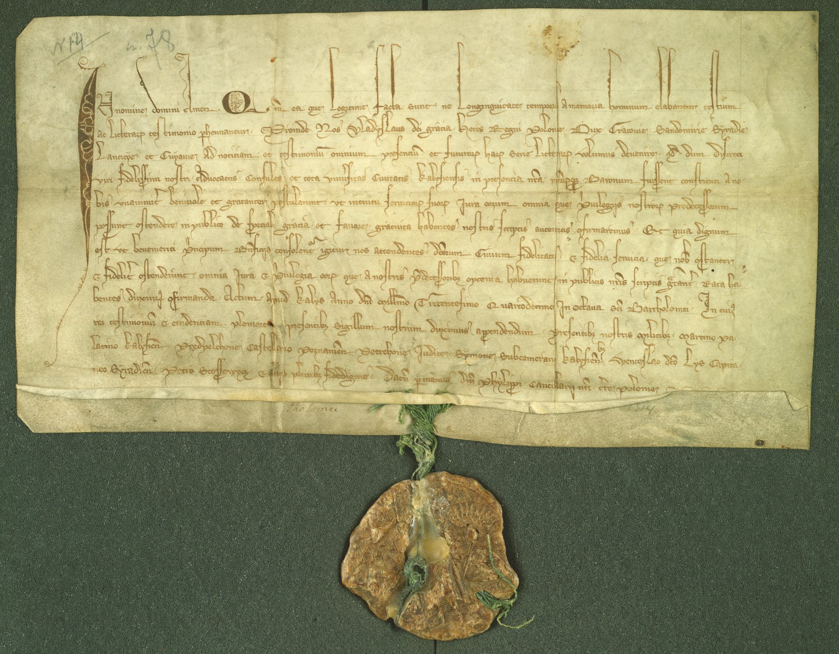 Zatwierdzenie przez dziedzica królestwa polskiego Władysława Łokietka w 1314 r. w Kaliszu, praw i przywilejów miasta Kalisza nadanych przez poprzedników.