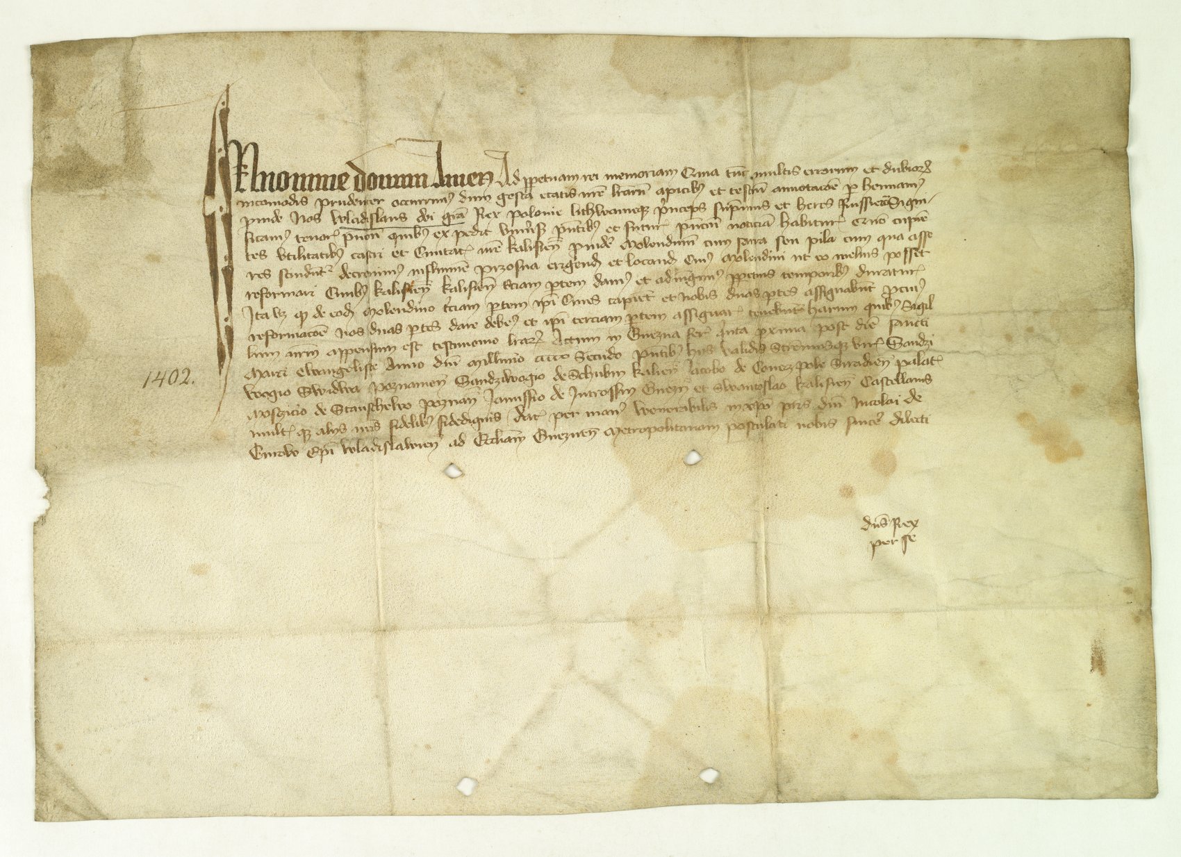 Dokument Władysława Jagiełły wydany w Gnieźnie w 1402 r., zezwalający mieszczanom kaliskim na lokowanie młyna na rzece Prośnie i uzyskiwanie 1/3 dochodów z tego młyna.