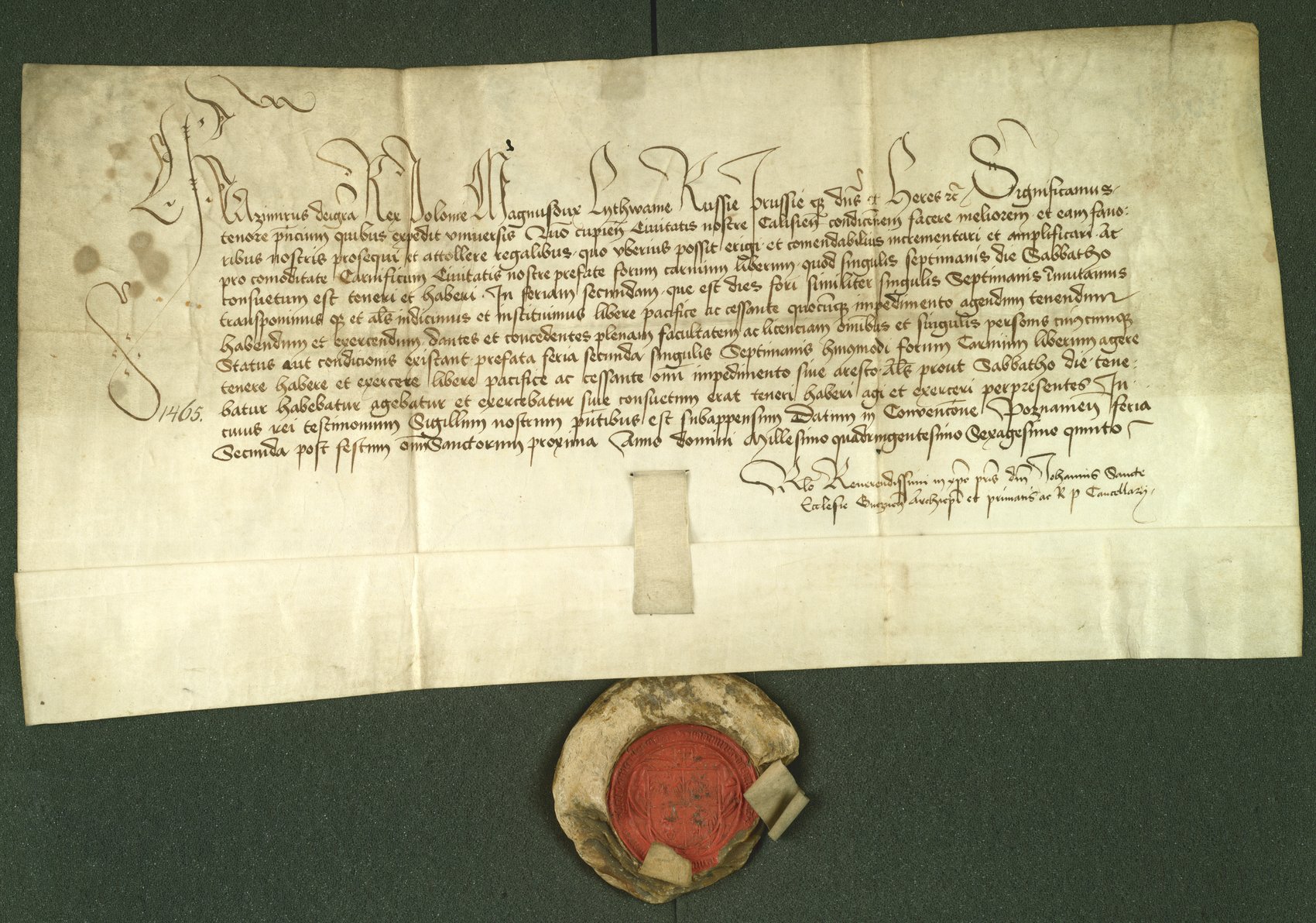 Dokument króla Kazimierza Jagiellończyka z 1465 r. nakazujący przeniesienie terminu targu mięsnego w Kaliszu z soboty na poniedziałek.