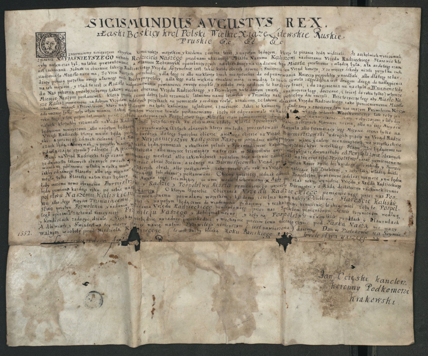 Kopia nieuwierzytelniona dokumentu wystawionego 12 marca 1552 r. na sejmie walnym w Piotrkowie przez Zygmunta II Augusta, który anulował w Kaliszu tryb dożywotniego sprawowania władzy burmistrzów i rajców, nadając w zamian pospólstwu prawo corocznego wybierania 12 kandydatów, pośród których starosta kaliski miał wybierać burmistrza i pięciu rajców i przyjmować od nich przysięgę wierności. Na ustępującą radę nałożył także obowiązek rozliczenia się z rocznych rządów przed nowa radą i pospólstwem.