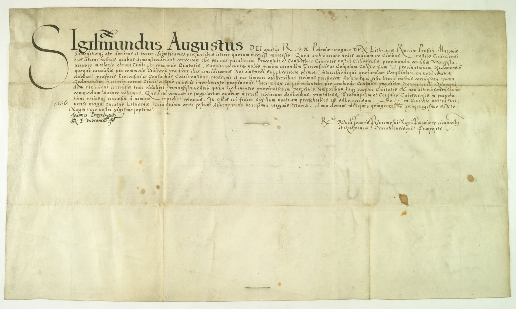 Nadanie przez króla Zygmunta Augusta miastu Kalisz w 1556 r. prawa propinacji piwa gdańskiego celem podniesienia dochodów miasta.