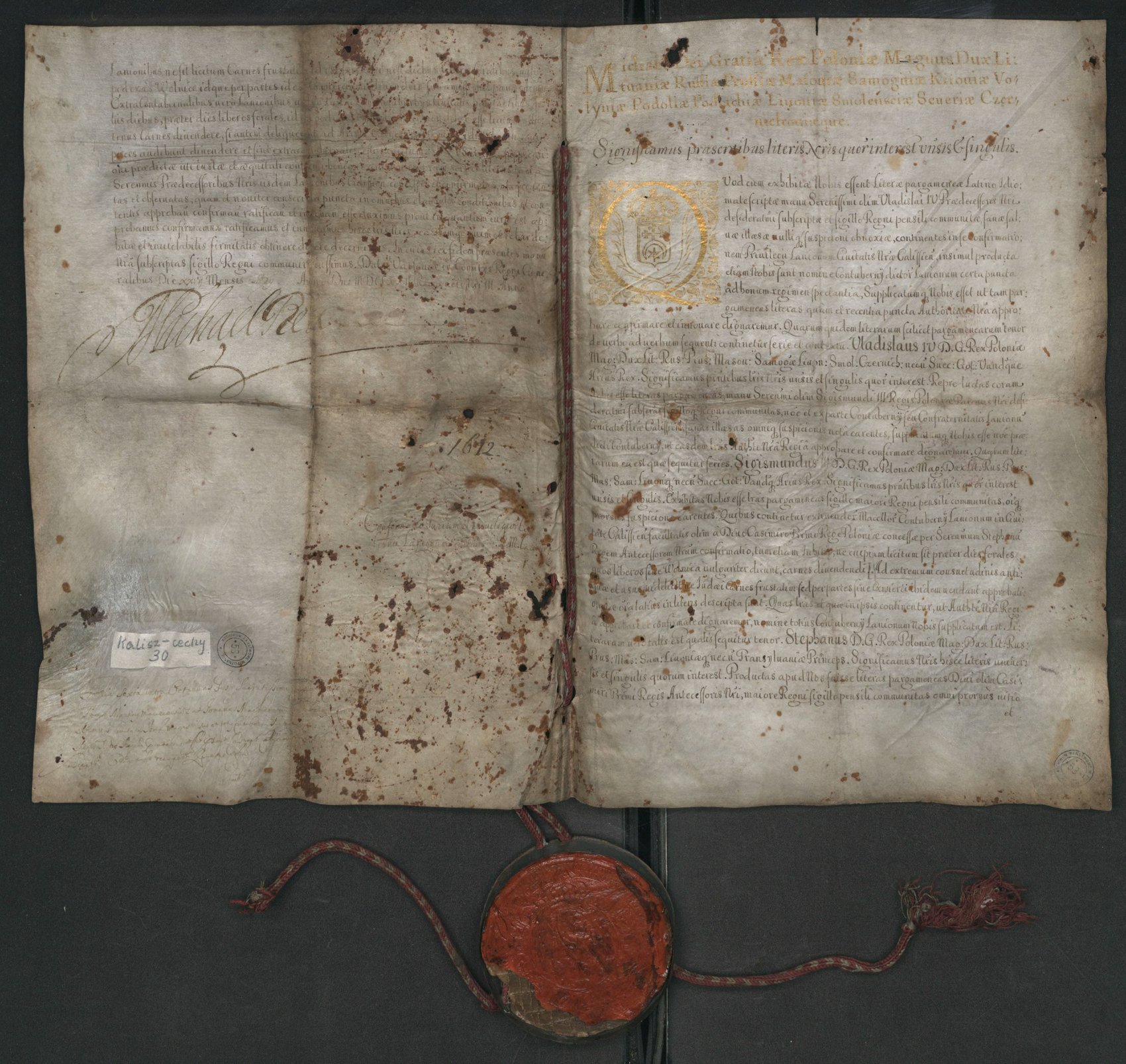 Potwierdzenie przez króla Michała Korybuta Wiśniowieckiego w 1672 r. przywileju dla cechu rzeźników w Kaliszu, nadanego przez króla Władysława IV w Warszawie w 1638 r., ustalającego prawo do jatek rzeźniczych, uprawnień do handlu mięsem oraz należności na rzecz starosty w Kaliszu.
