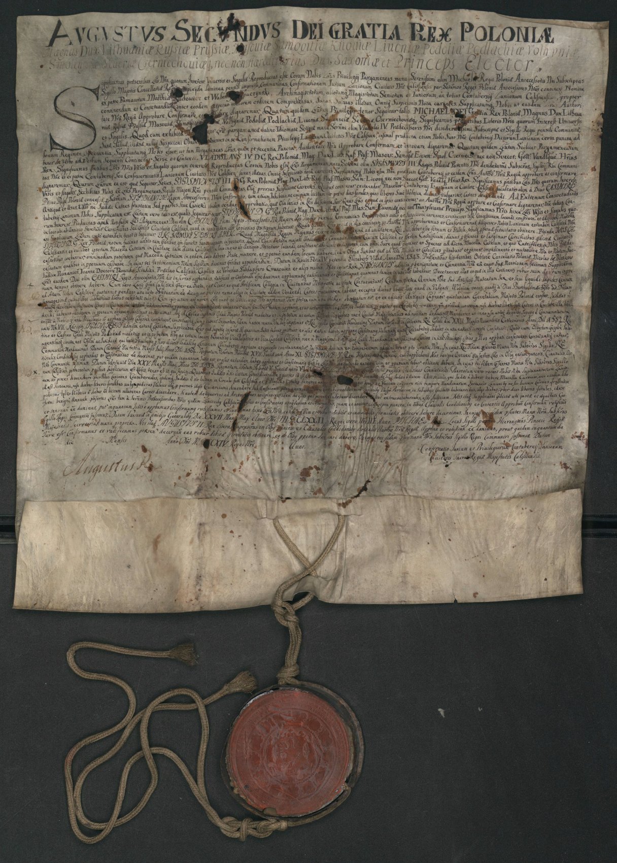 Potwierdzenie przez króla polskiego i elektora saskiego Augusta II Mocnego z 1714 r. przywileju króla Michała Korybuta Wiśniowieckiego z 1672 r. dla cechu rzeźników w Kaliszu.