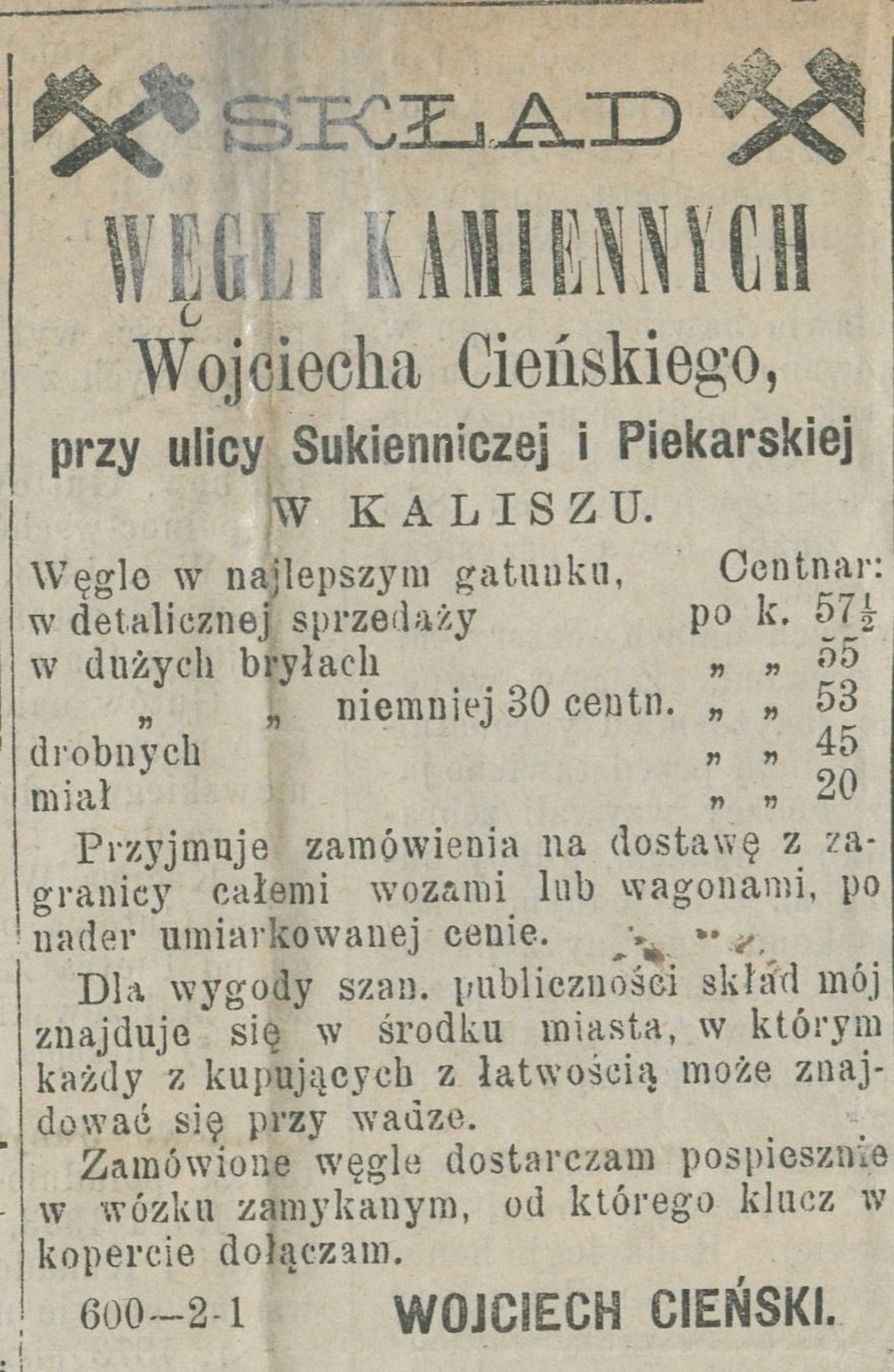 Ogłoszenie z 16 października 1887 r., które ukazało się w 85. Numerze gazety "Kaliszanin", dotyczące sprzedaży opału w składzie węgla kamiennego Wojciecha Cieńskiego przy ul. Sukienniczej i Piekarskiej w Kaliszu. W swojej ofercie skład oferował węgle najlepszego gatunku, sprzedaż detaliczną, opał w dużych bryłach, przyjmował także zamówienia na dostawę węgla z zagranicy całymi wozami lub wagonami po umiarkowanej cenie.