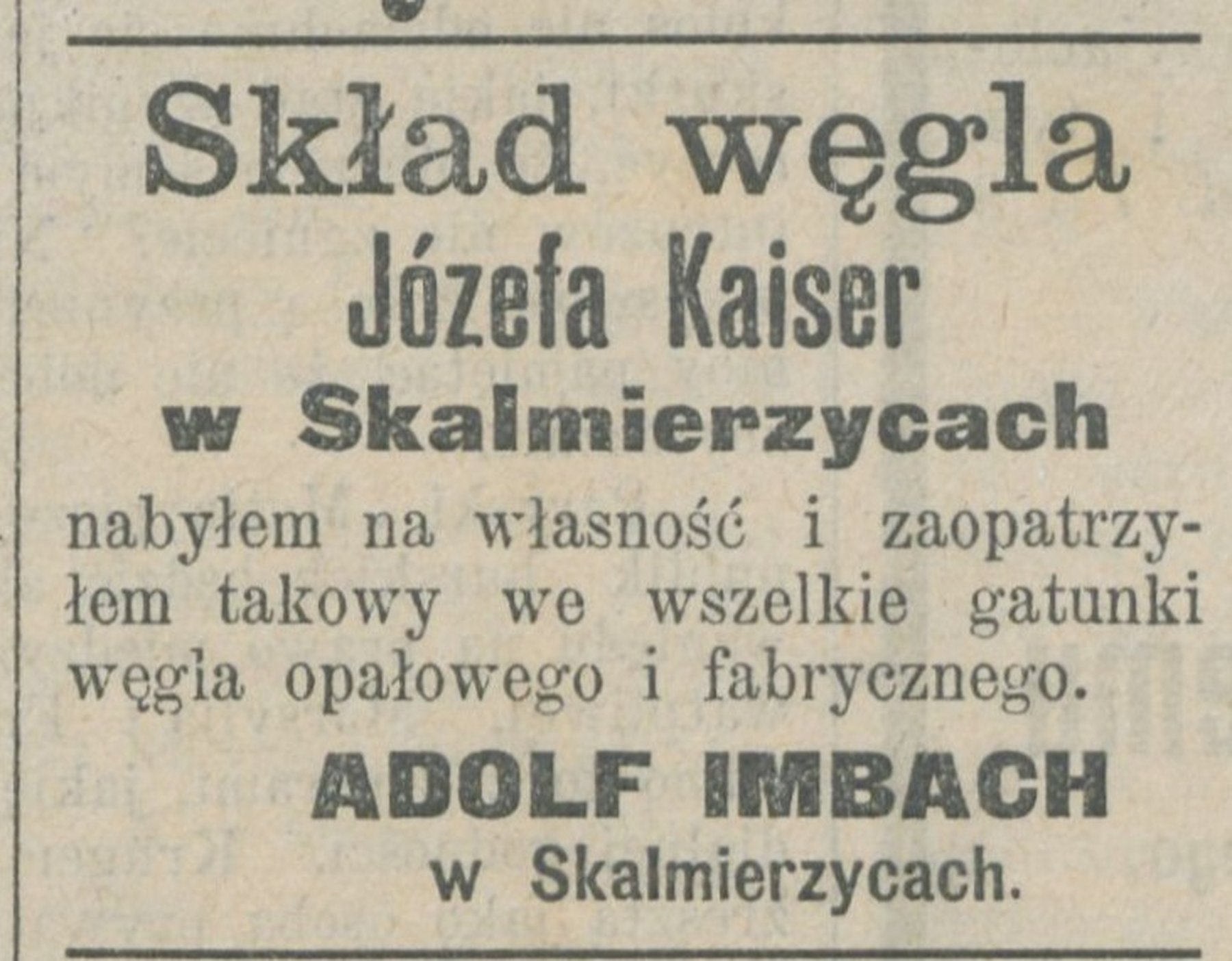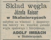 Ogłoszenie z 2 Listopada 1900 r., które ukazało się w 259. numerze "Gazety Kaliskiej", dotyczące sprzedaży węgla we wszystkich gatunkach, zarówno opałowego jak i fabrycznego, w składzie węgla Józefa Kaisera w Skalmierzycach.