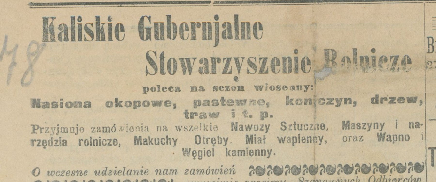 Ogłoszenie z 28 marca 1905 r., które ukazało się w 87. numerze "Gazety Kaliskiej", dotyczące sprzedaży m.in. węgla kamiennego przez Kaliskie Gubernialne Stowarzyszenie Rolnicze.
