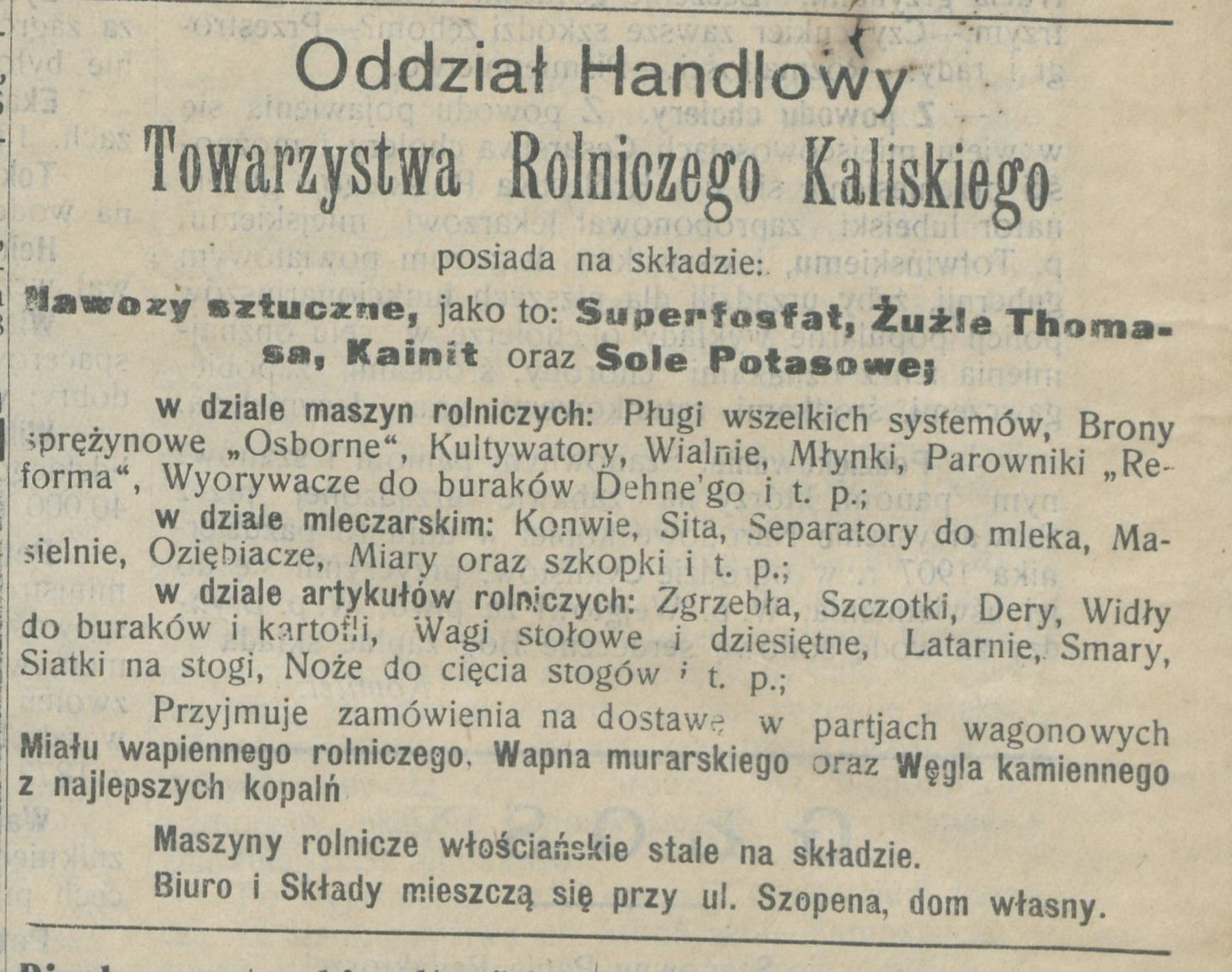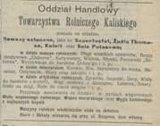 Ogłoszenie z 23 października 1907 r., które ukazało się w 248 numerze "Gazety Kaliskiej", dotyczące m.in. przyjmowania zamówień na węgiel kamienny z najlepszych kopalń w partiach wagonowych przez Oddział Handlowy Towarzystwa Rolniczego Kaliskiego.