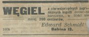 Ogłoszenie z 14 września 1910 r., które ukazało się w 206 numerze "Gazety Kaliskiej", dotyczące sprzedaży węgla przez Edwarda Schmidta z pierwszorzędnych zagranicznych kopalń, dostarczanego hurtowo w ilości nie mniej niż 200 centnarów.