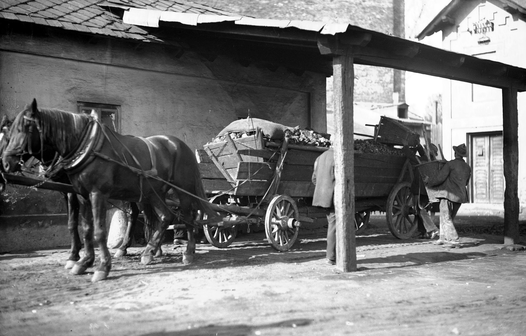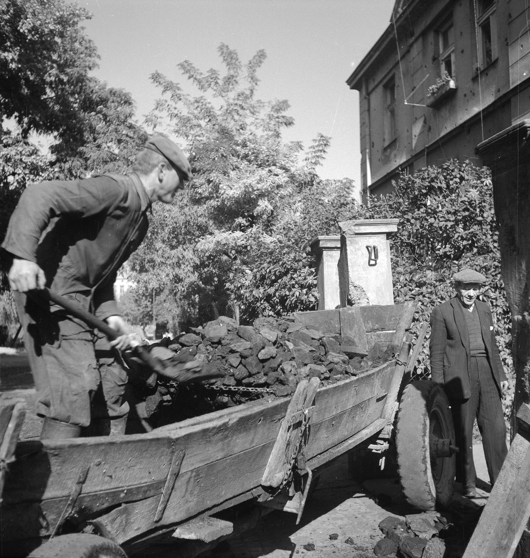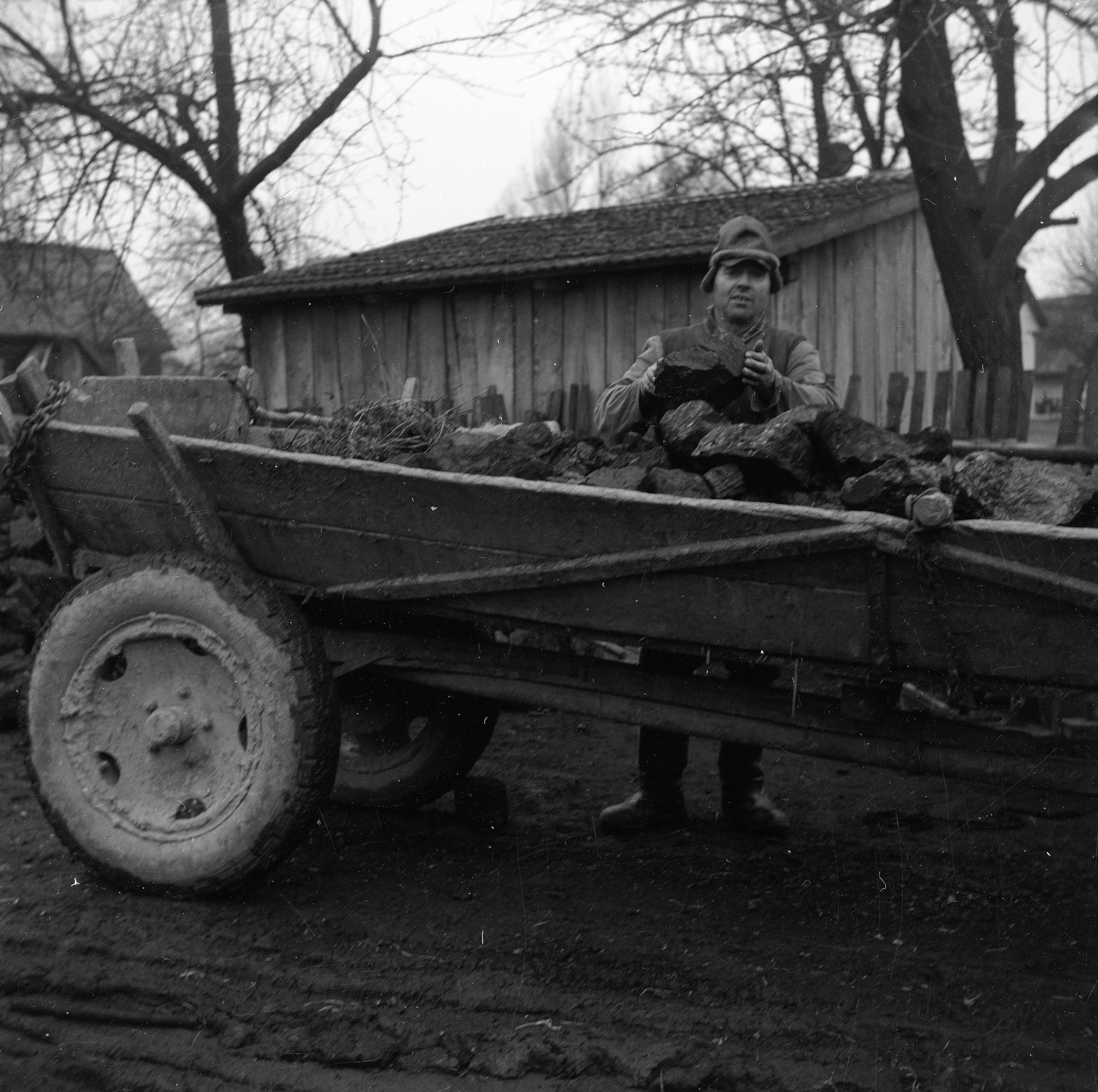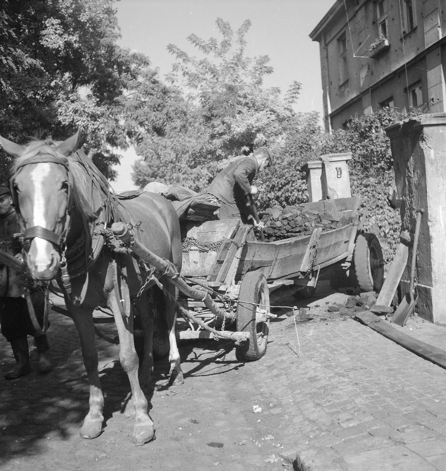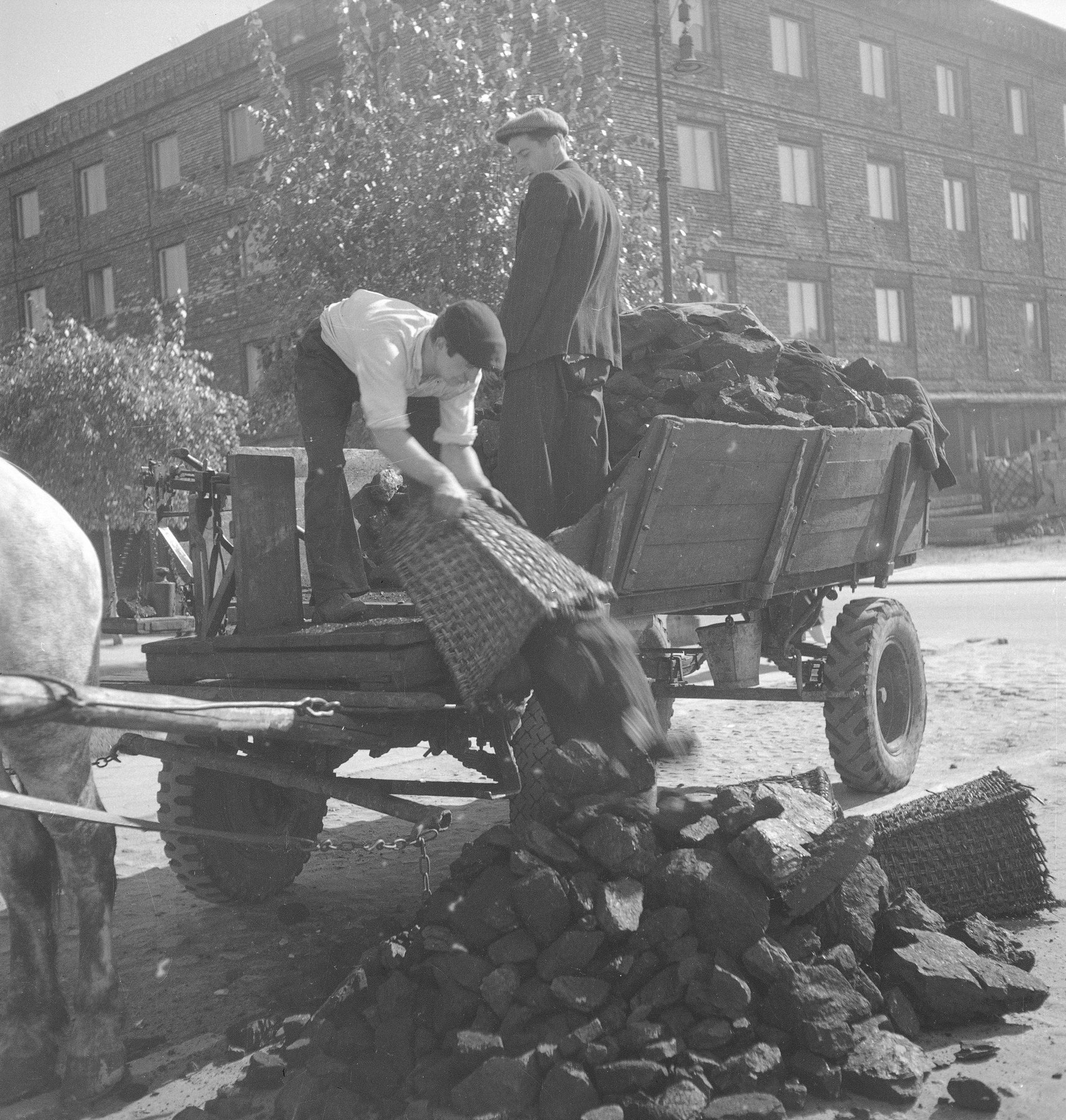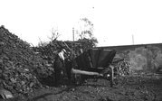 Fotografia z 1975 r. prezentująca mężczyznę wyładowującego węgiel z furmanki konnej.