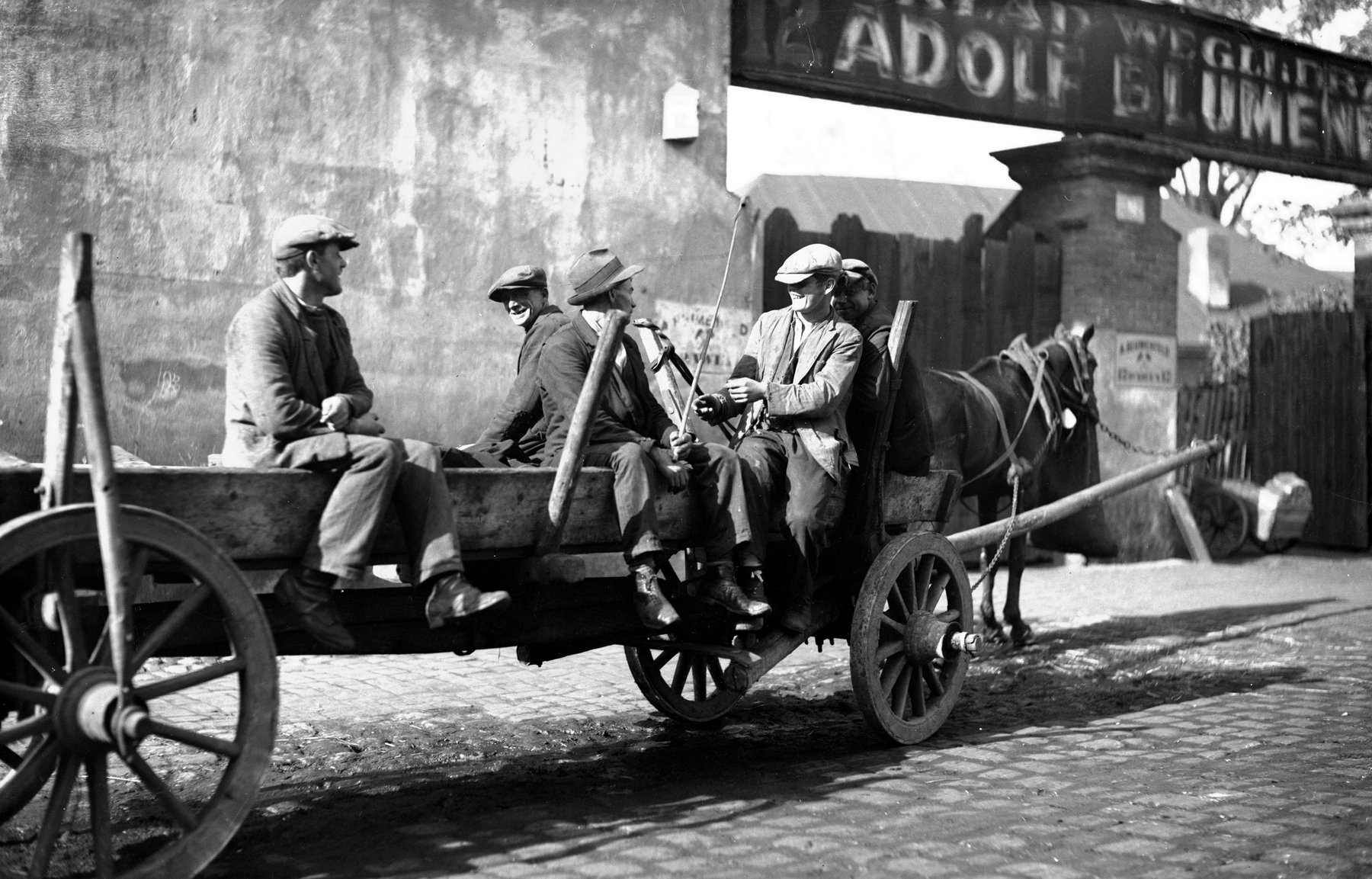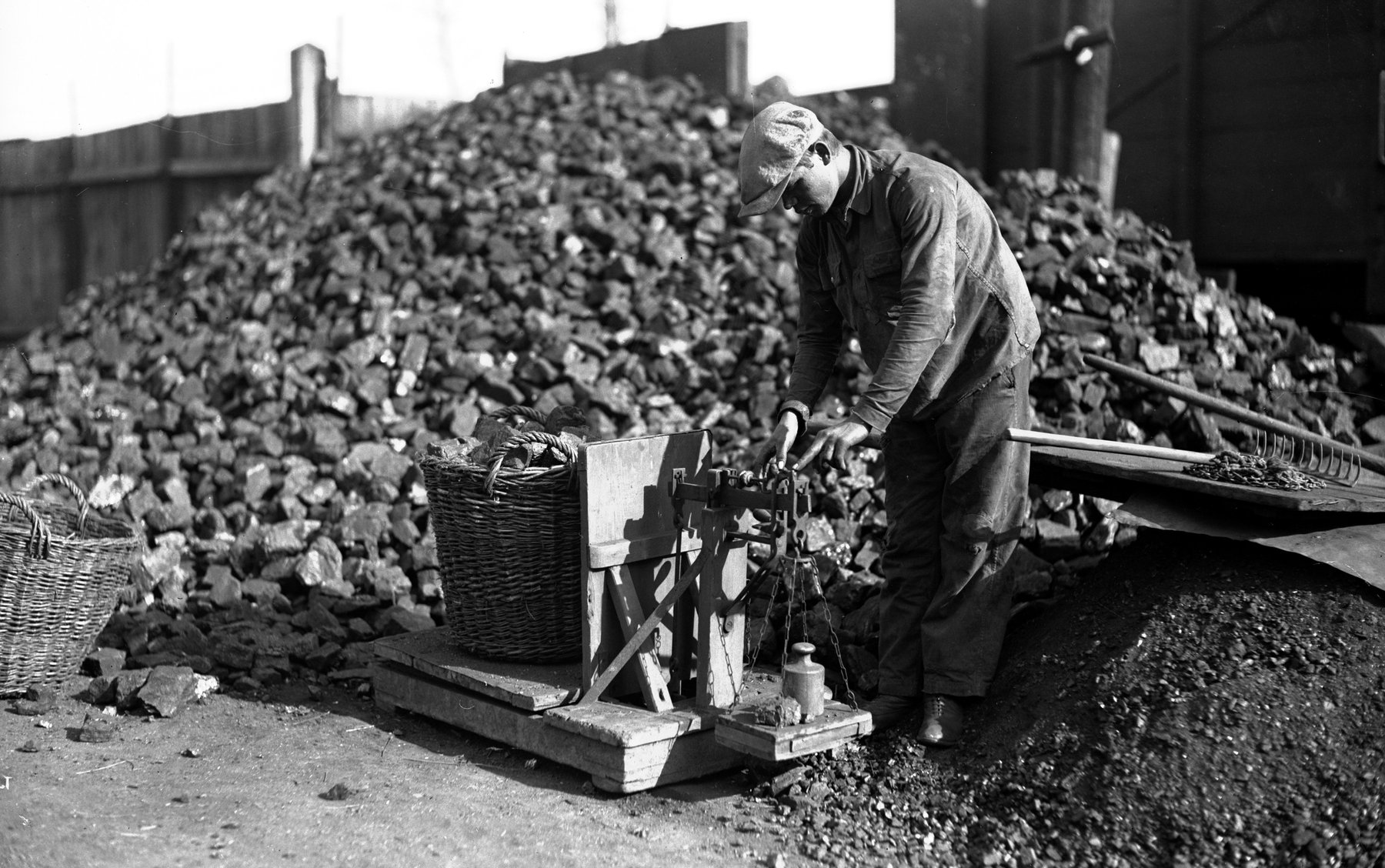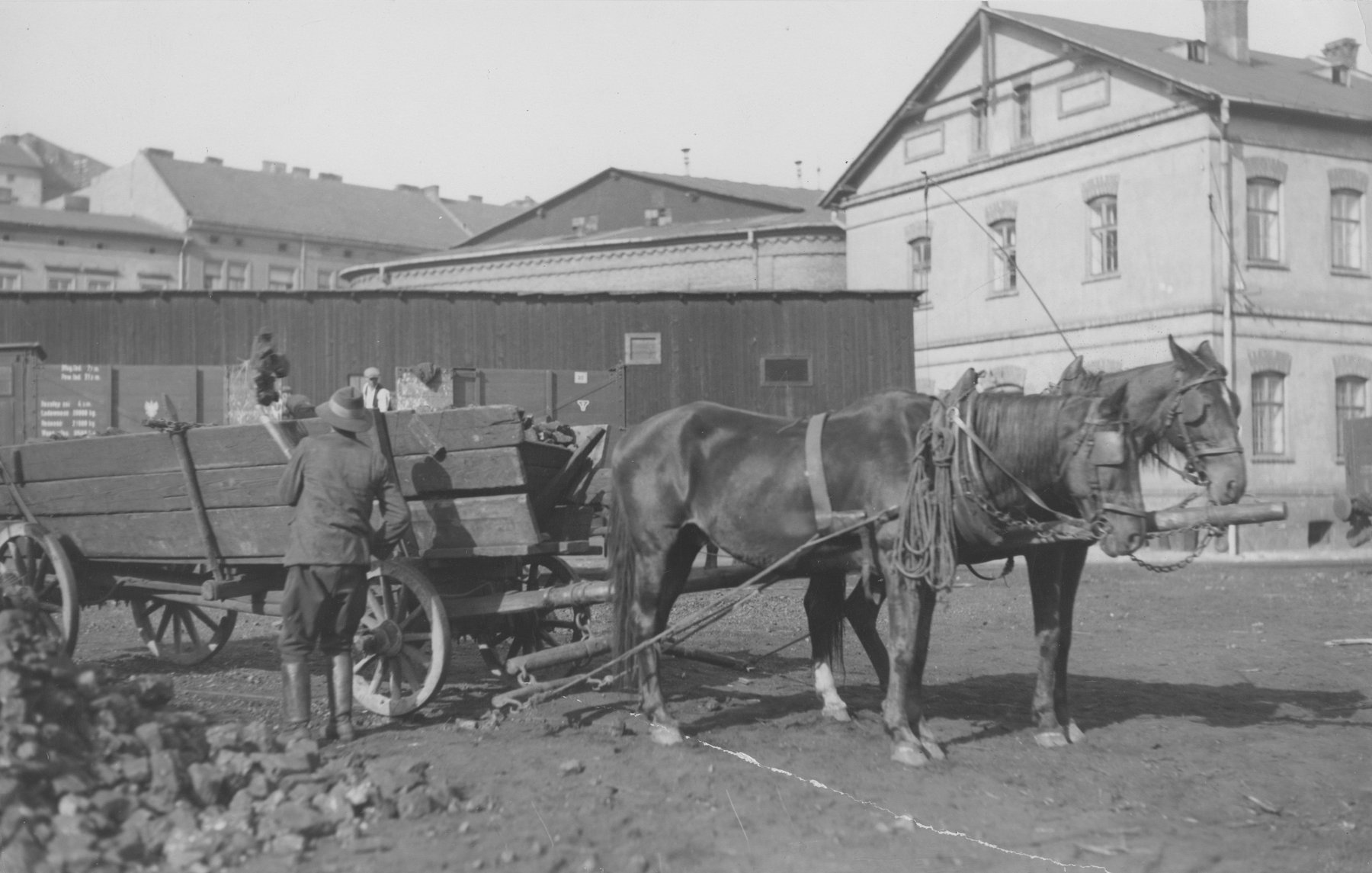 Fotografie z lat 1925-1935 prezentujące ważenie i załadunek węgla na wóz na terenie składu opału Adolfa Blumenfelda przy ul. Pawiej 12 w Krakowie.
