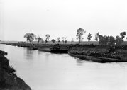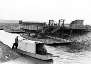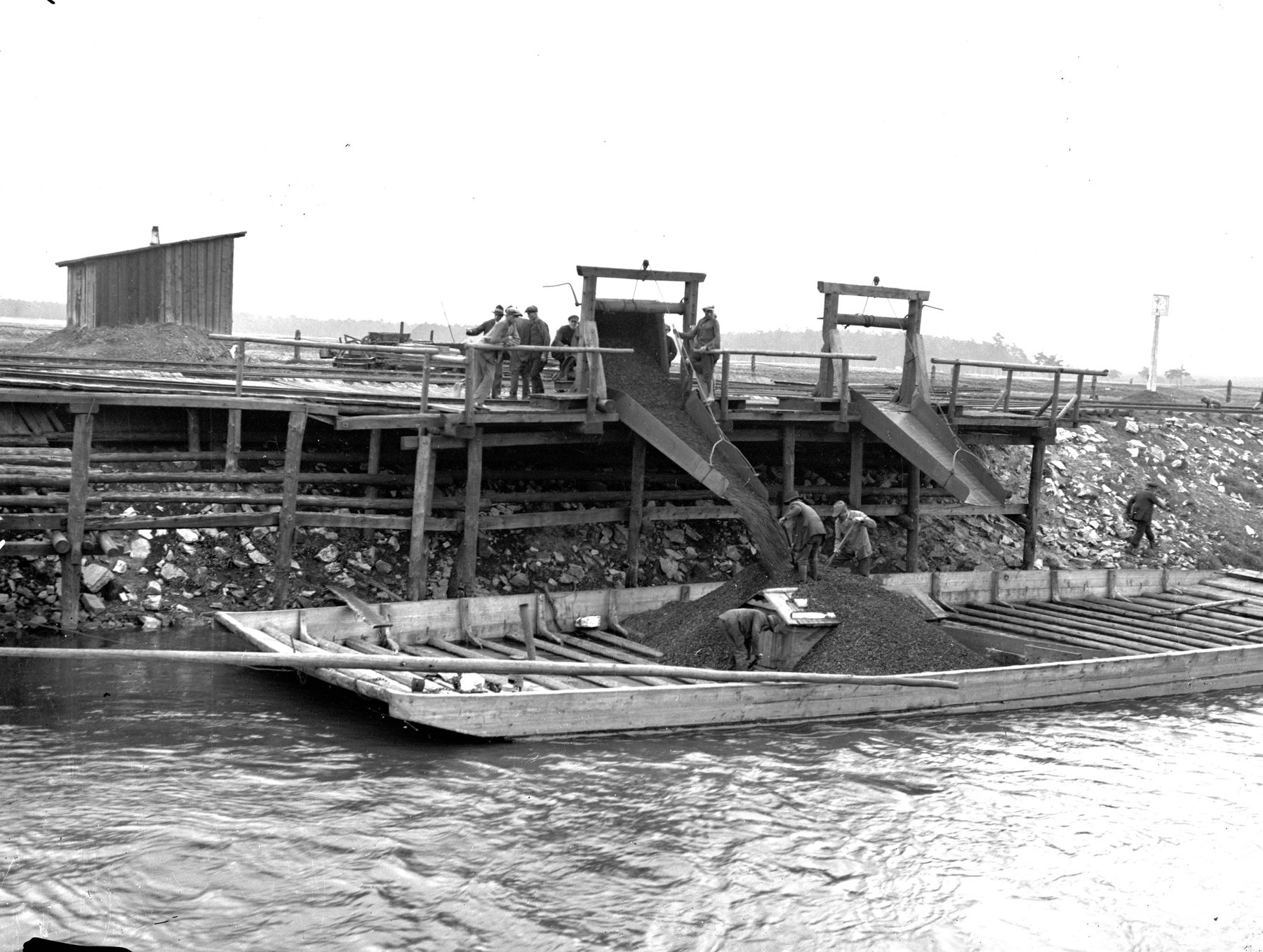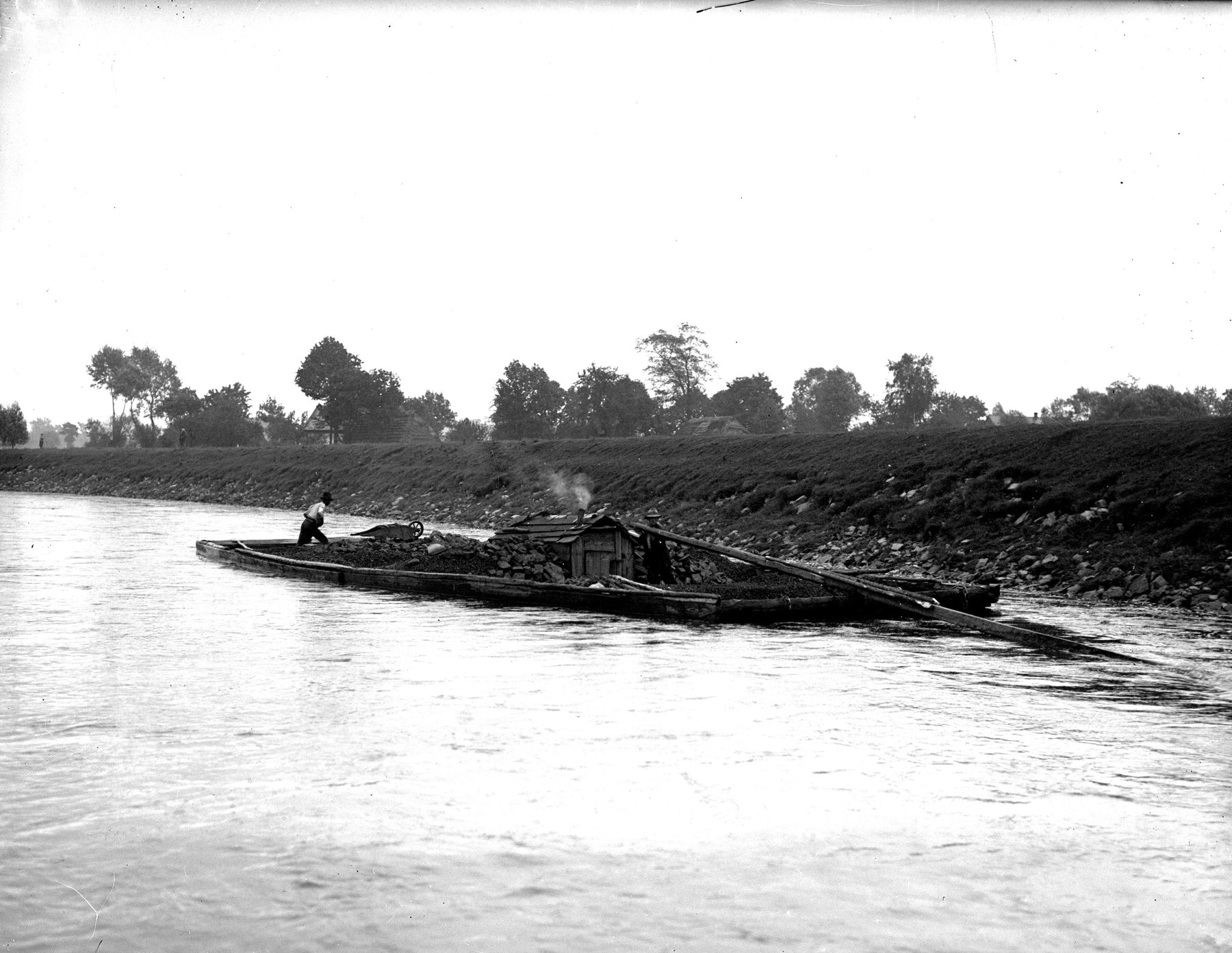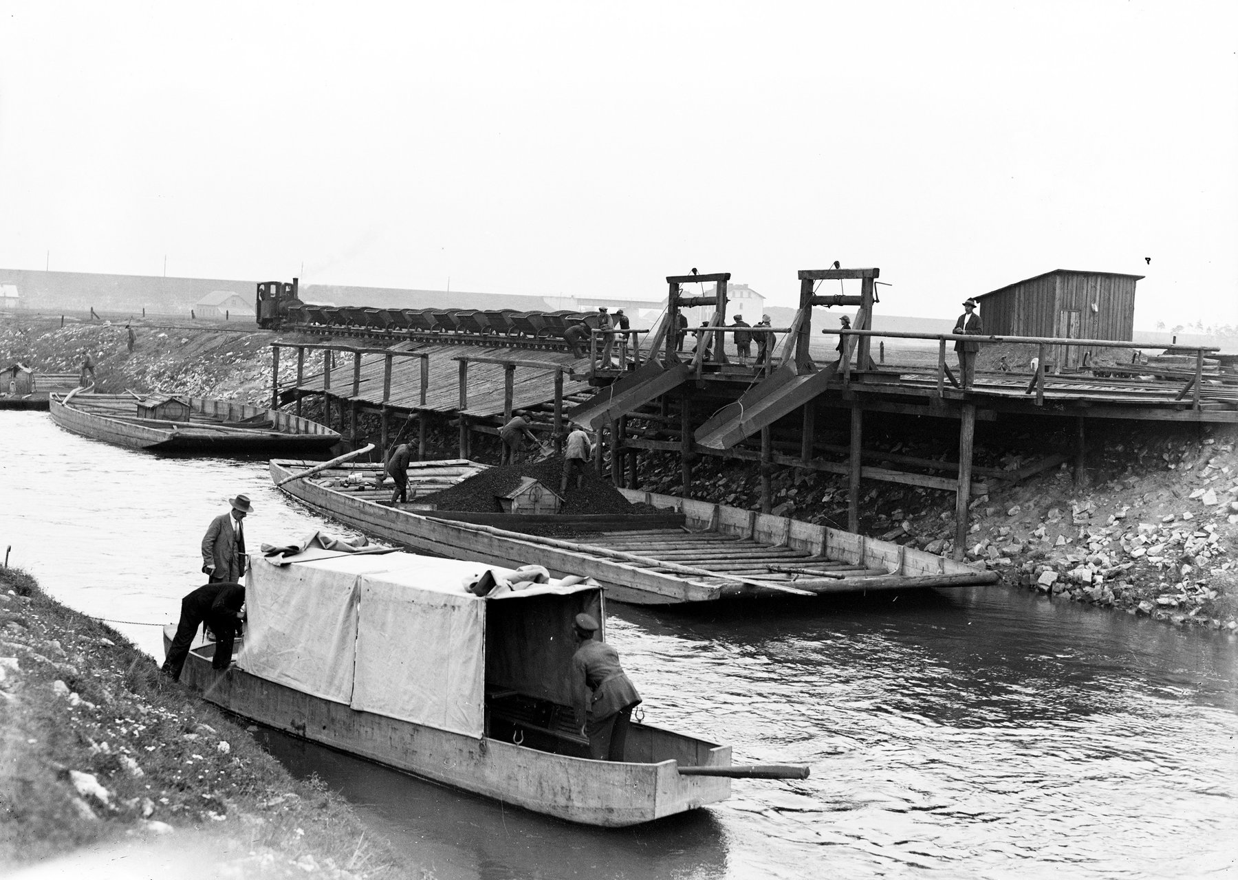 Fotografie z 1932 r. prezentujące przeładunek i przewóz węgla galarami na rzece Przemszy.