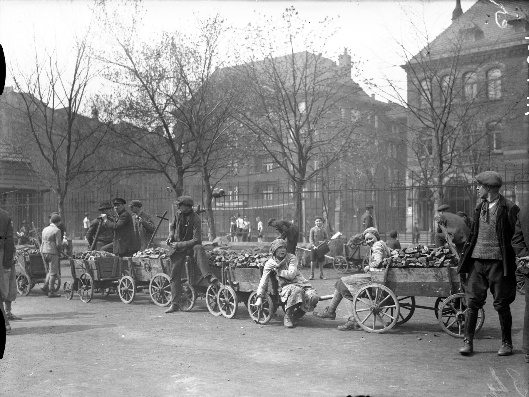 Fotografia z 1934 r. prezentująca uliczną sprzedaż węgla w Katowicach.