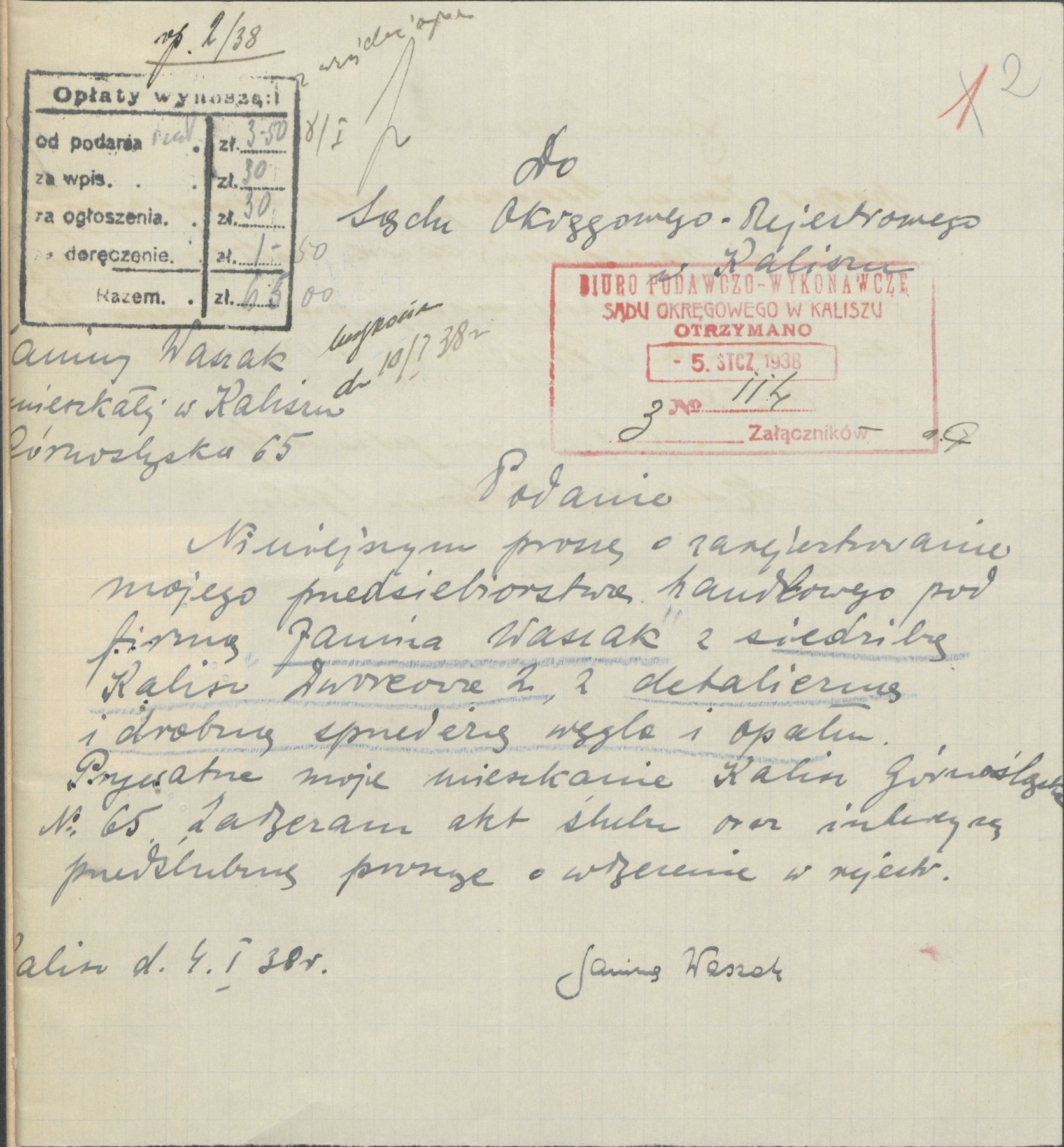 Podanie z 4 stycznia 1938 r. z prośbą o zarejestrowanie przedsiębiorstwa handlowego zajmującego się drobną sprzedażą węgla i opału należącego do Janiny Waszak z Kalisza.