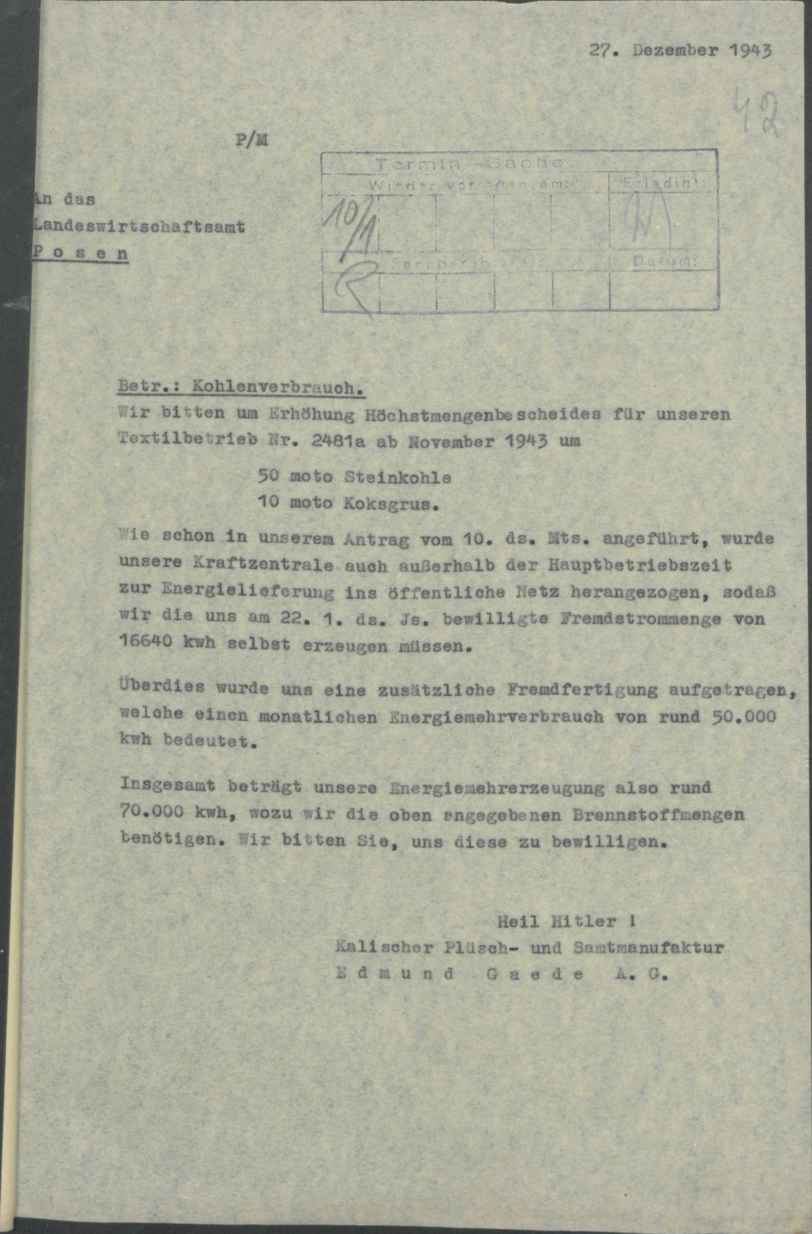 Dokumenty wystawione przez kaliską Manufakturę Pluszu i Aksamitu 27 grudnia 1943 r., które dotyczyły zużycia węgla w fabryce, a także stanowiły prośbę o zwiększenia limitu na opał dla fabryki.