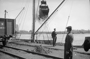 Fotografia z 1948 r. prezentująca przeładunek węgla w Porcie Gdańskim.