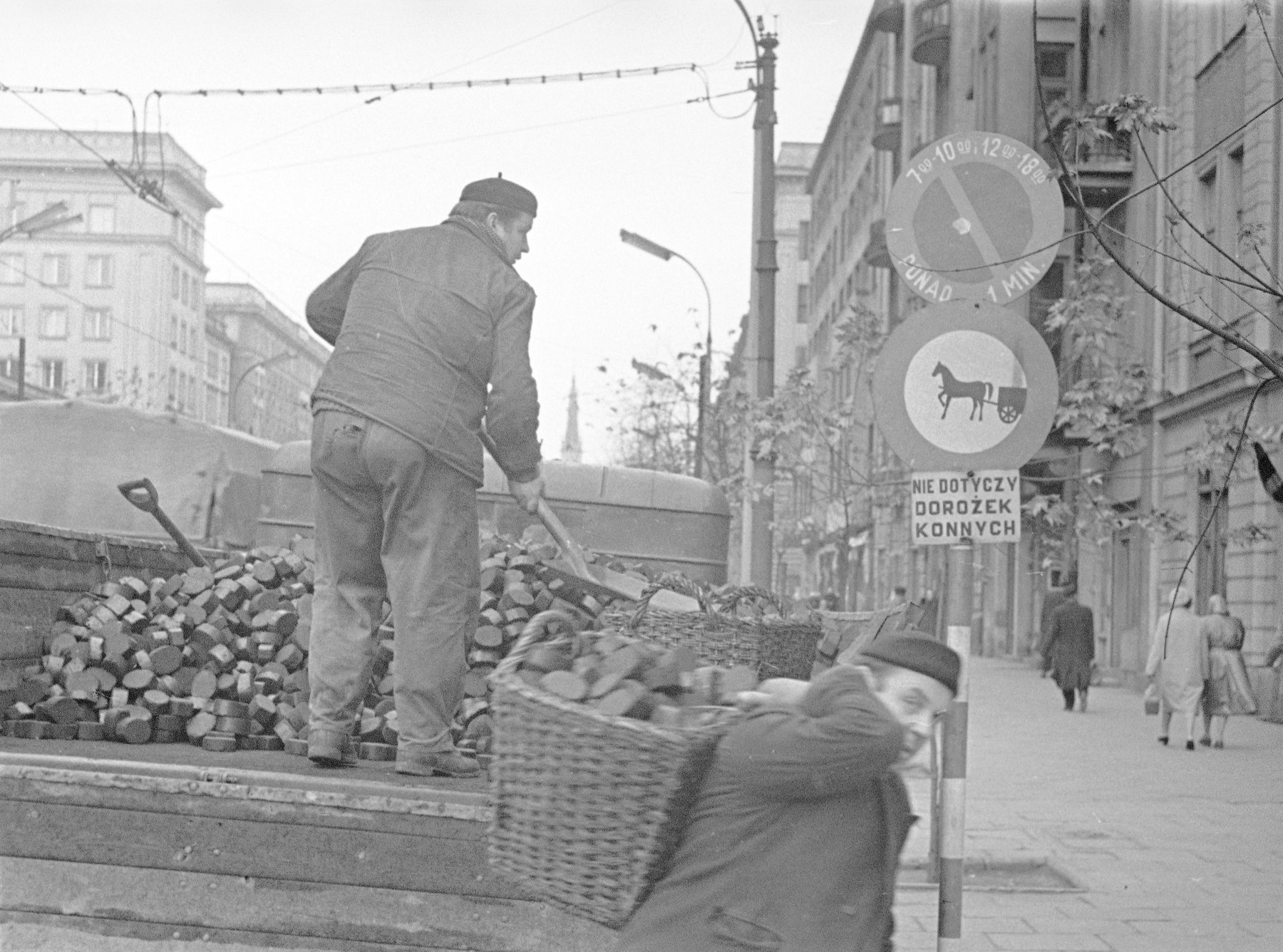 Fotografia z lat 1953-1963 prezentująca dwóch mężczyzn, którzy rozładowują ciężarówkę z węglem, przenosząc opał w wiklinowych koszach na jednej z warszawskich ulic.