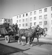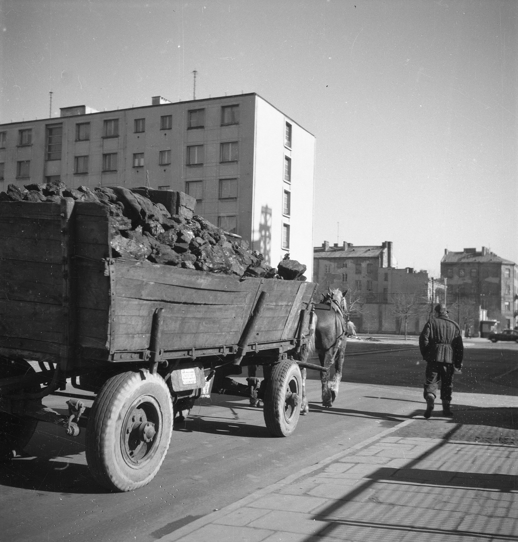 Fotografie z lat 1955-1965 prezentujące wóz konny przewożący węgiel na ul. Madalińskiego w Warszawie