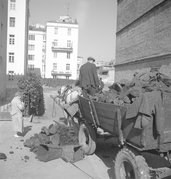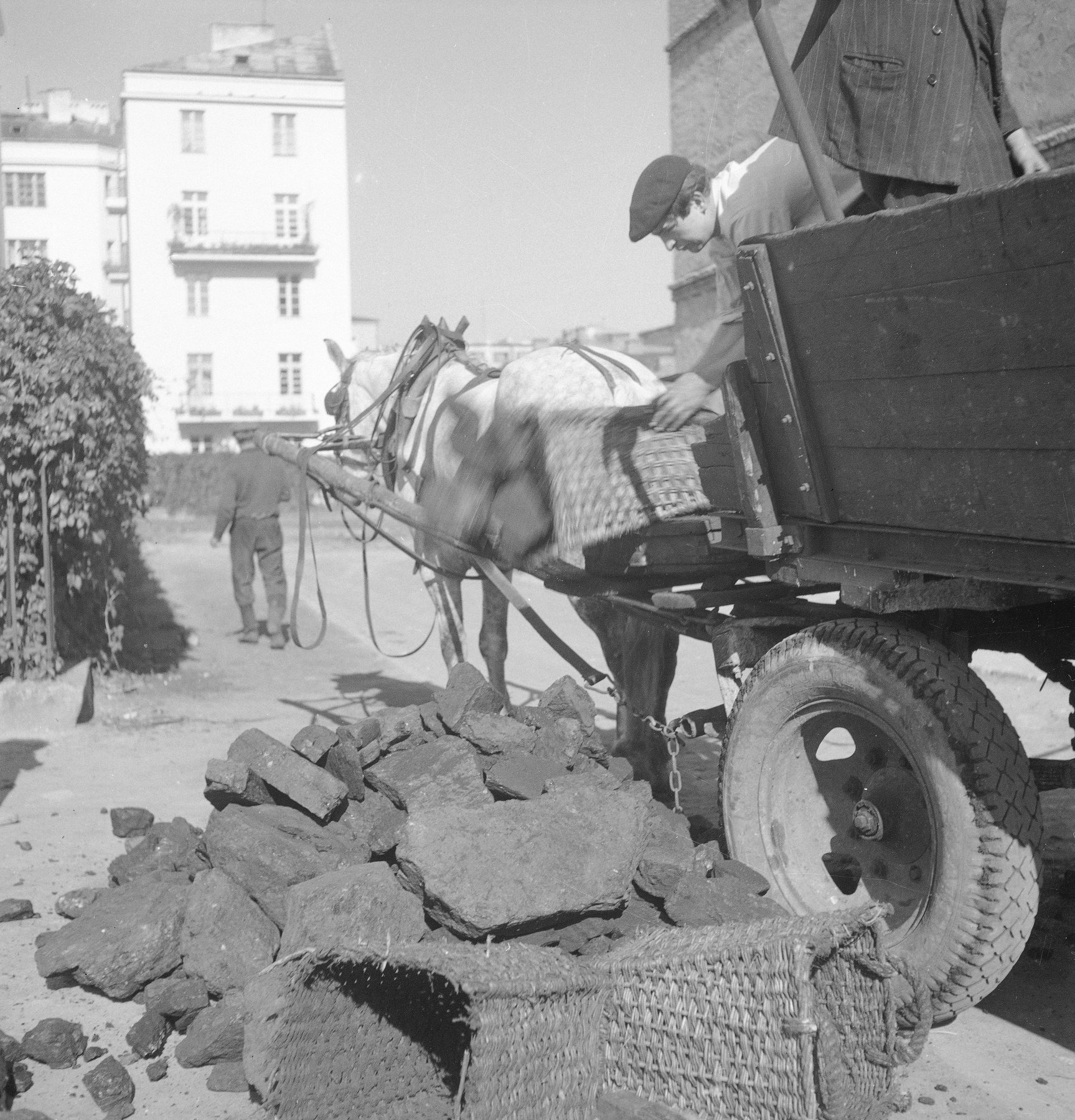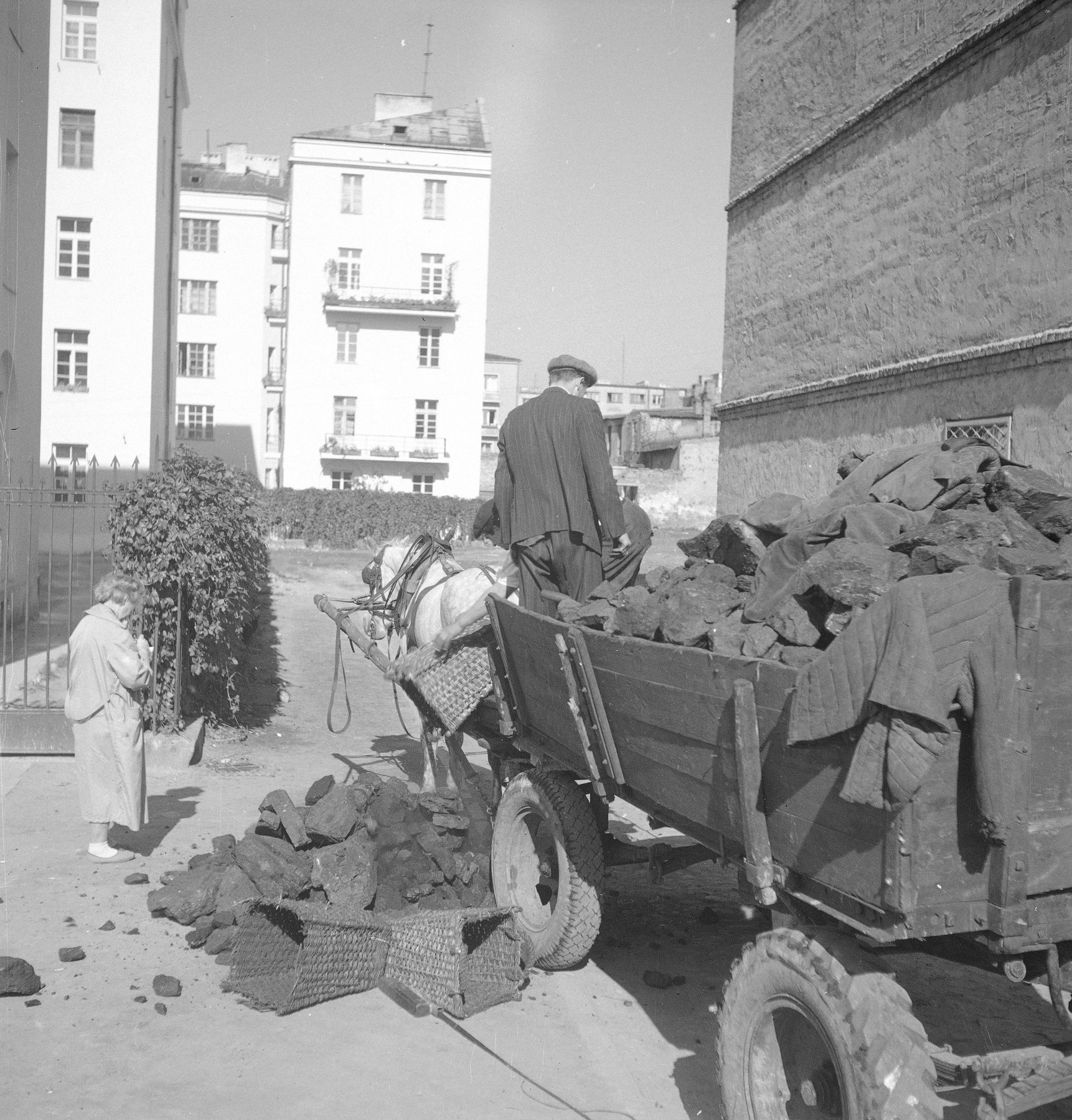 Fotografie z lat 1955-1965 prezentujące mężczyznę rozładowującego węgiel z wozu konnego na ul. Karłowicza w Warszawie.