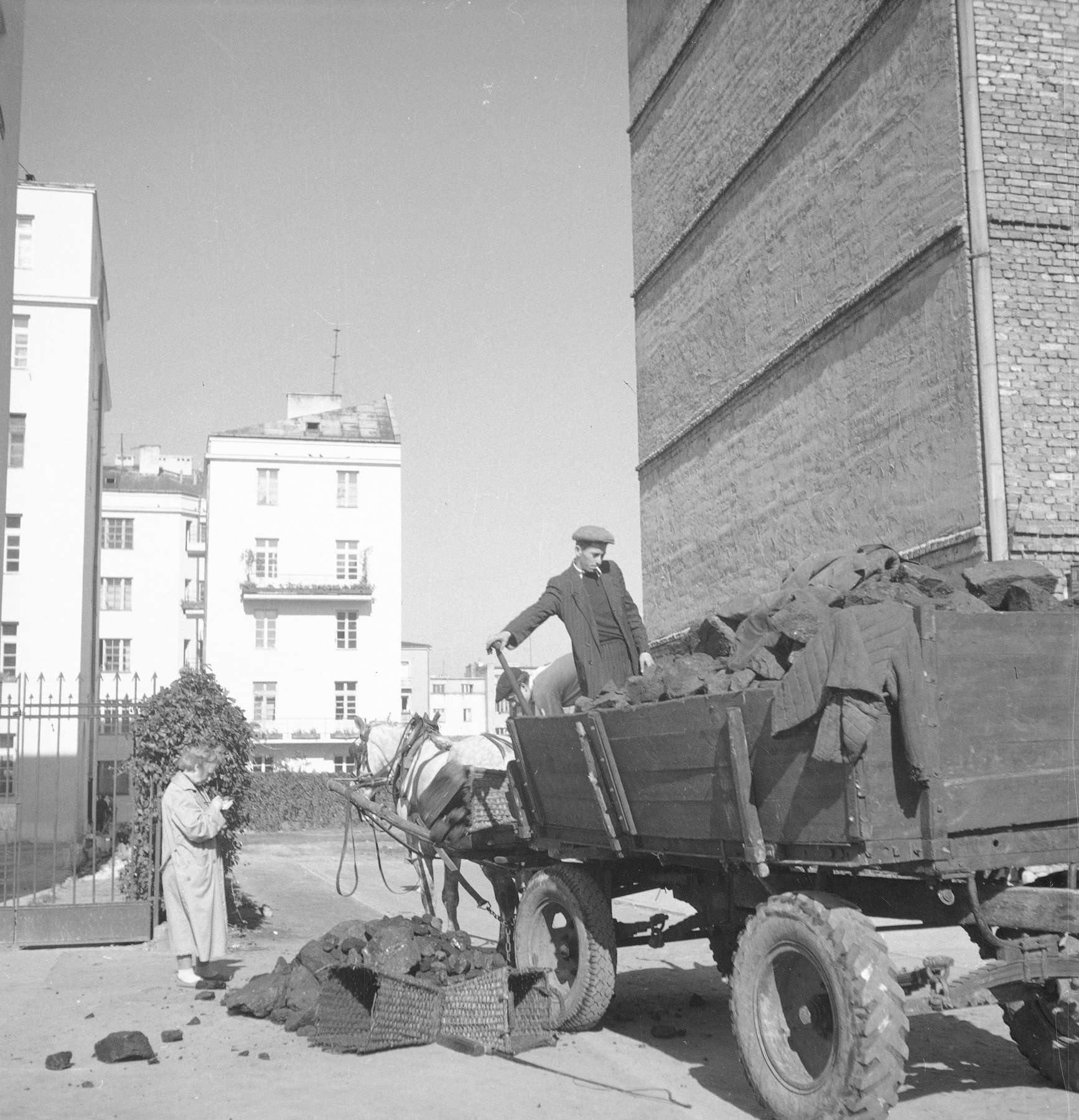 Fotografia z 1958 r. prezentująca mężczyznę wysypującego węgiel z wozu konnego na ul. Madalińskiego w Warszawie.