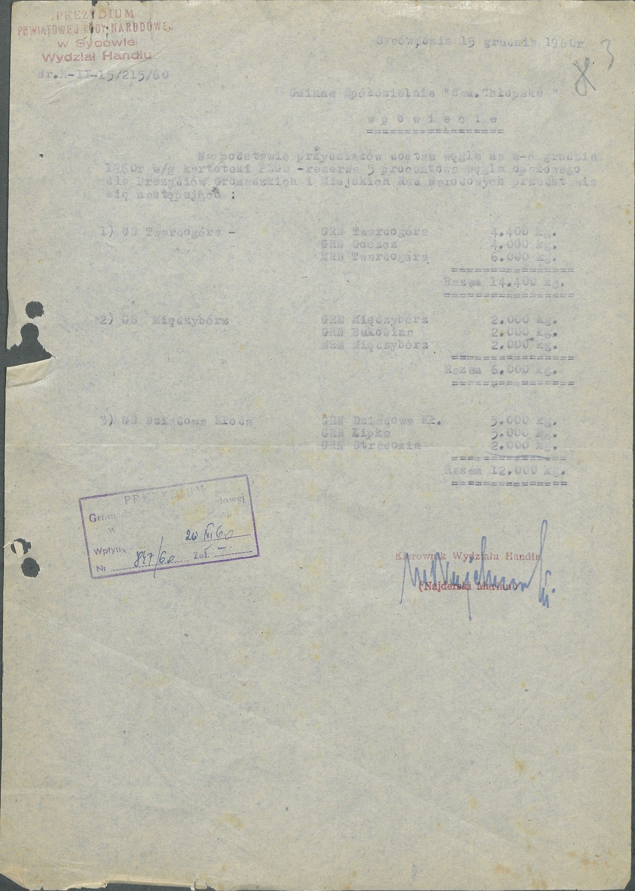 Dokument z 1960 r. wydany przez Prezydium Gromadzkiej Rady Narodowej w Sycowie, dotyczący przydziału dostaw węgla na miesiąc grudzień 1960 r. dla GS Twardogóra, GS Międzybórz oraz GS Dziadowa Kłoda.