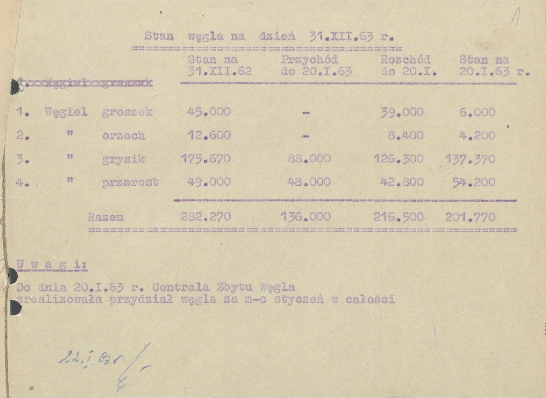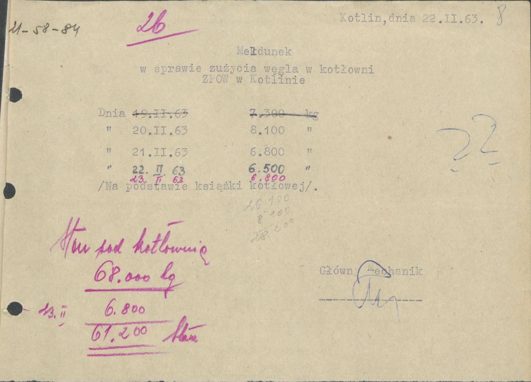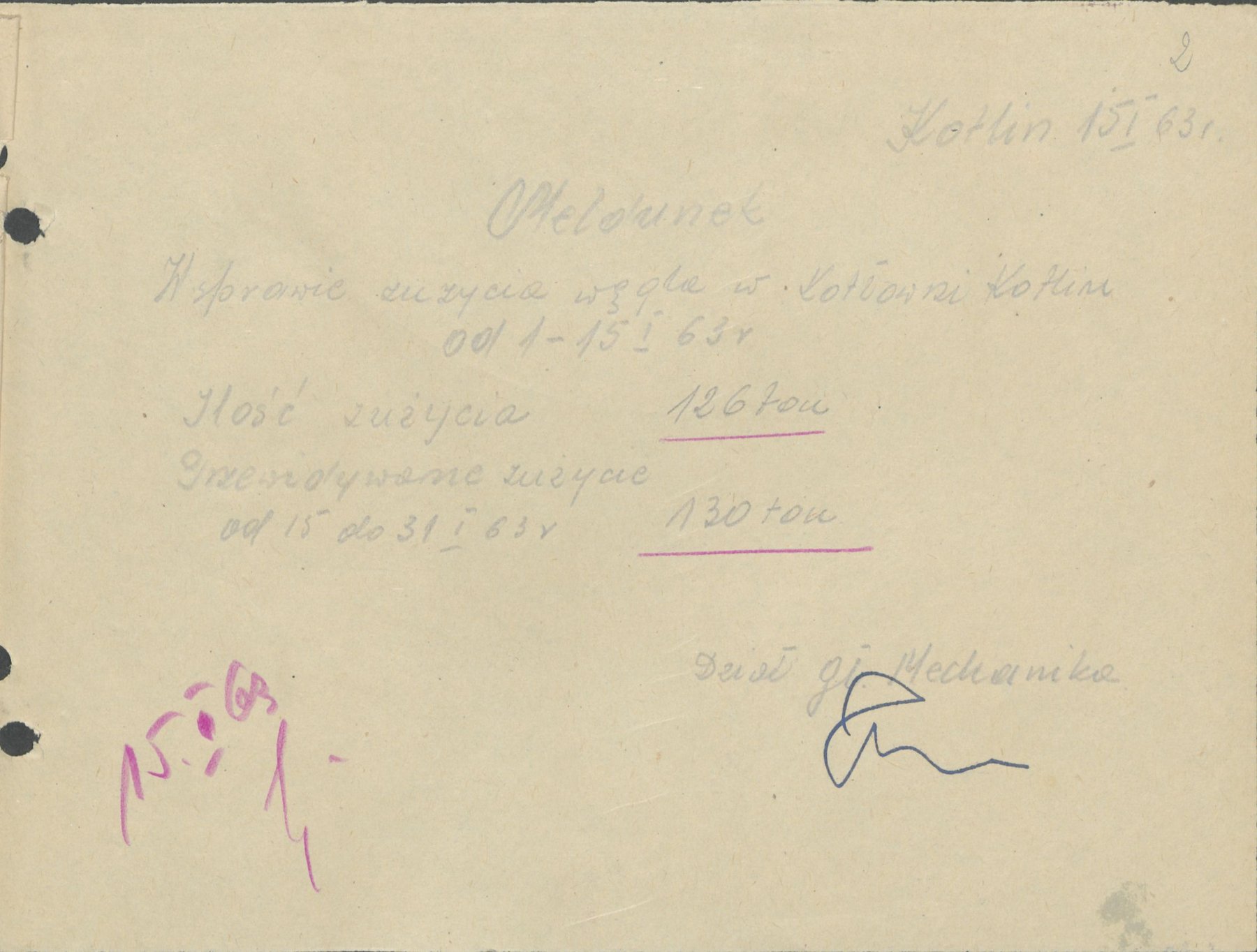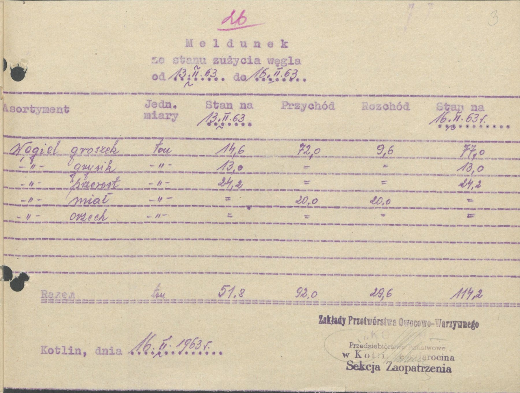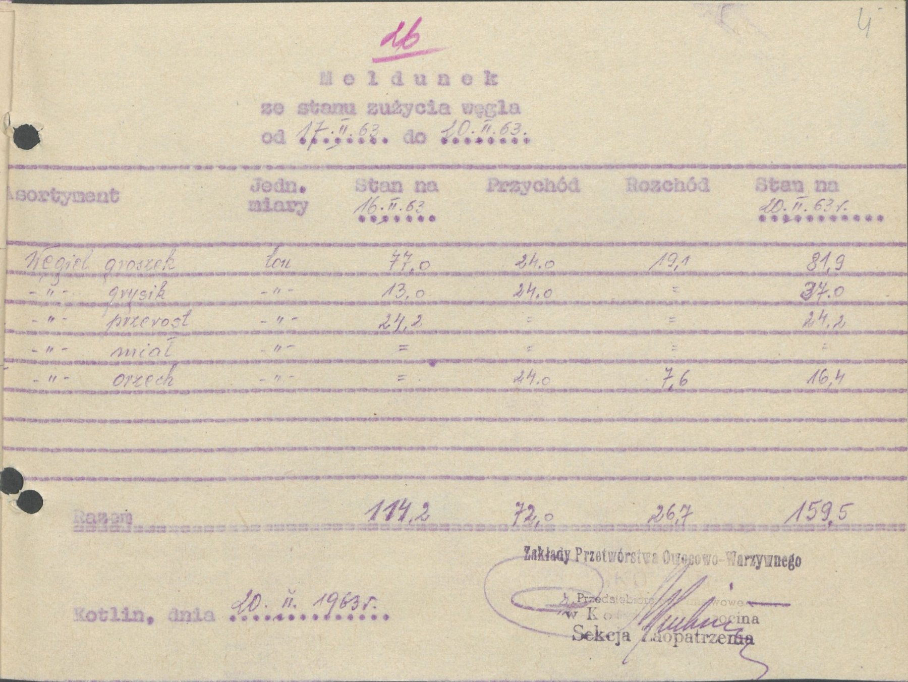 Meldunki z 1963 r. informujące o zużycia węgla w kotłowni Zakładów Przemysłu Owocowo-Warzywnego "Kotlin" w Kotlinie.