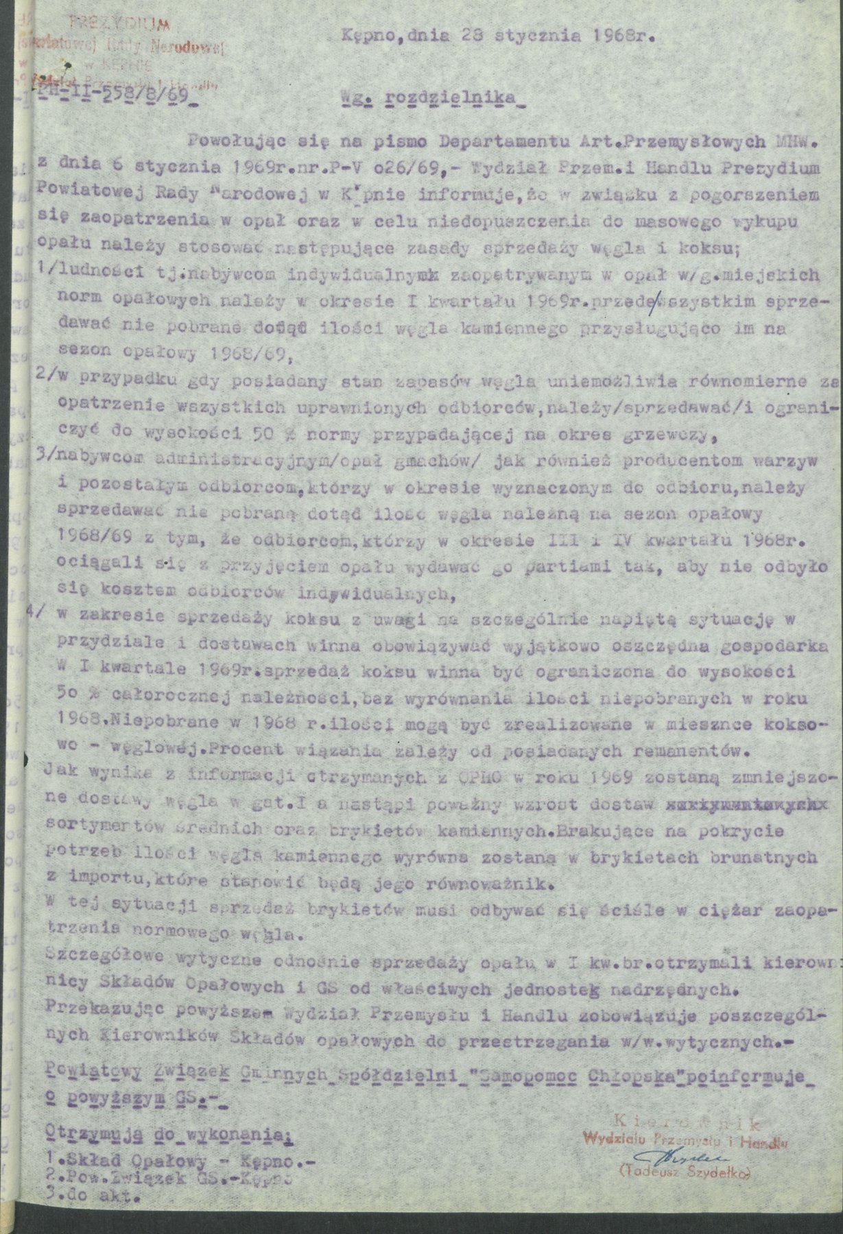 Pismo z 28 stycznia 1968 r., wystosowane przez Wydział Przemysłu i Handlu Prezydium Powiatowej Rady Narodowej w Kępnie, informujące o zasadach sprzedaży węgla i koksu. Wprowadzone zasady miały na celu niedopuszczenie do masowego wykupu opału.