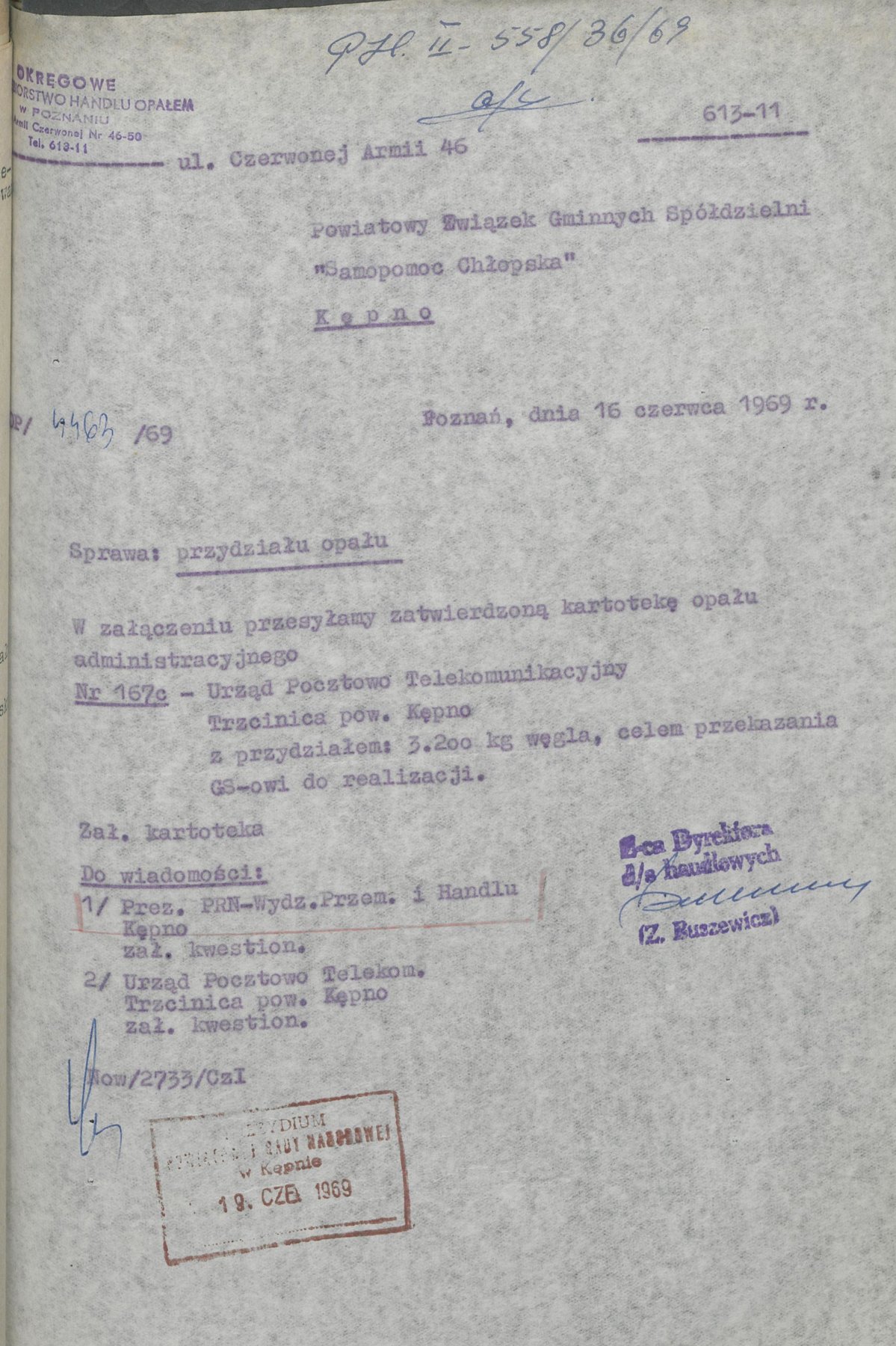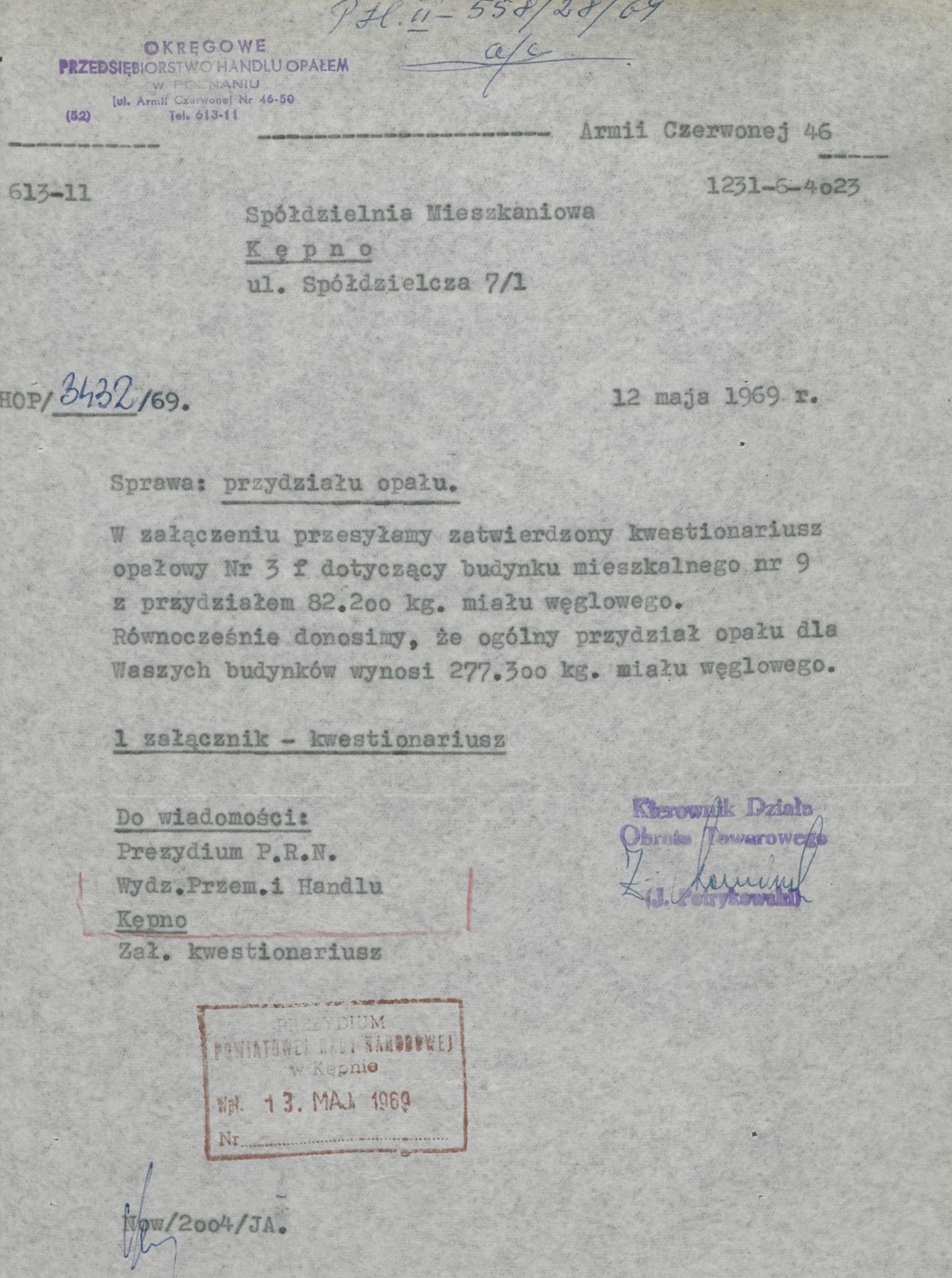 Pismo z 12 maja 1969 r. informujące Spółdzielnię Mieszkaniową w Kępnie o przydziale opału w liczbie 82,200 kg.