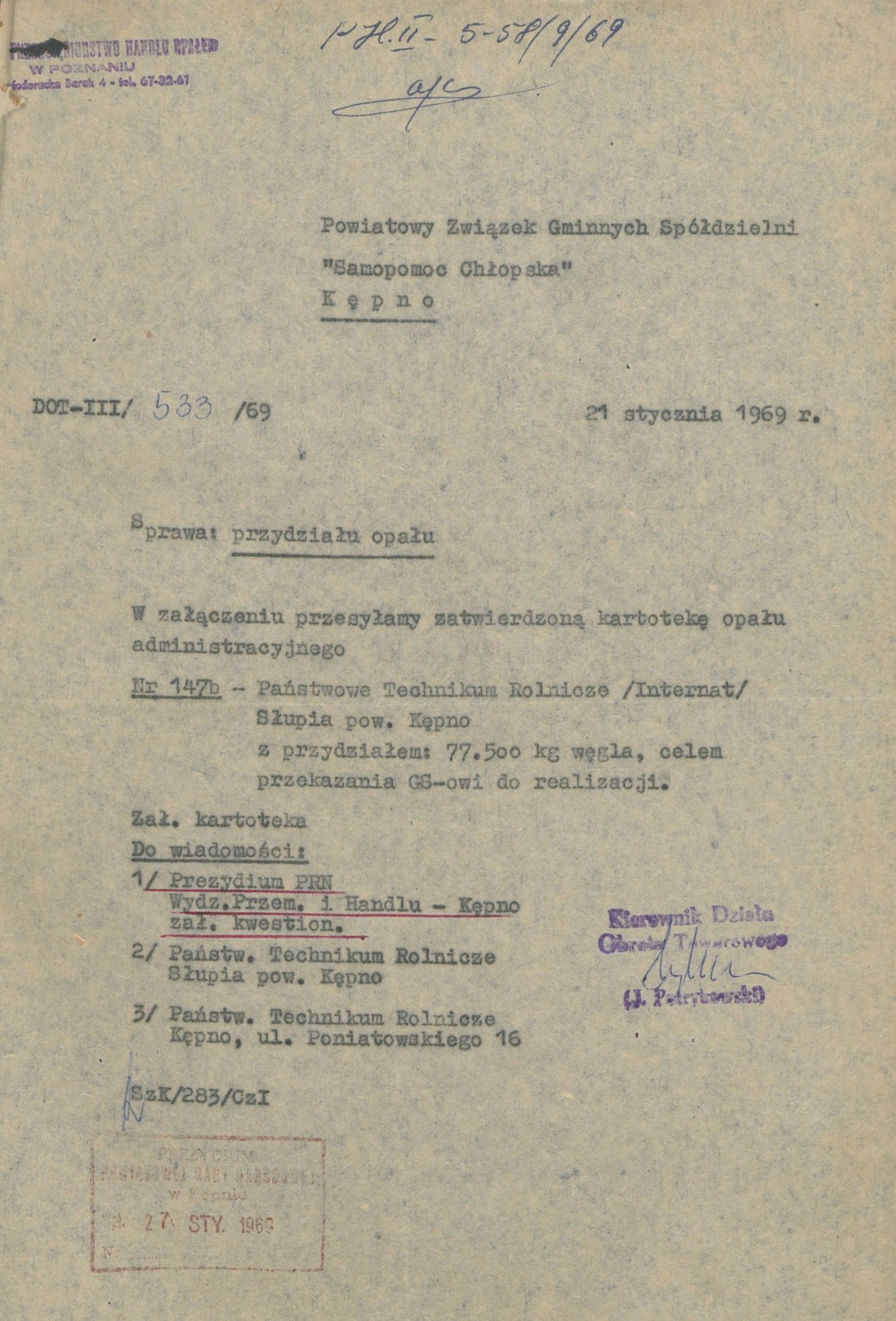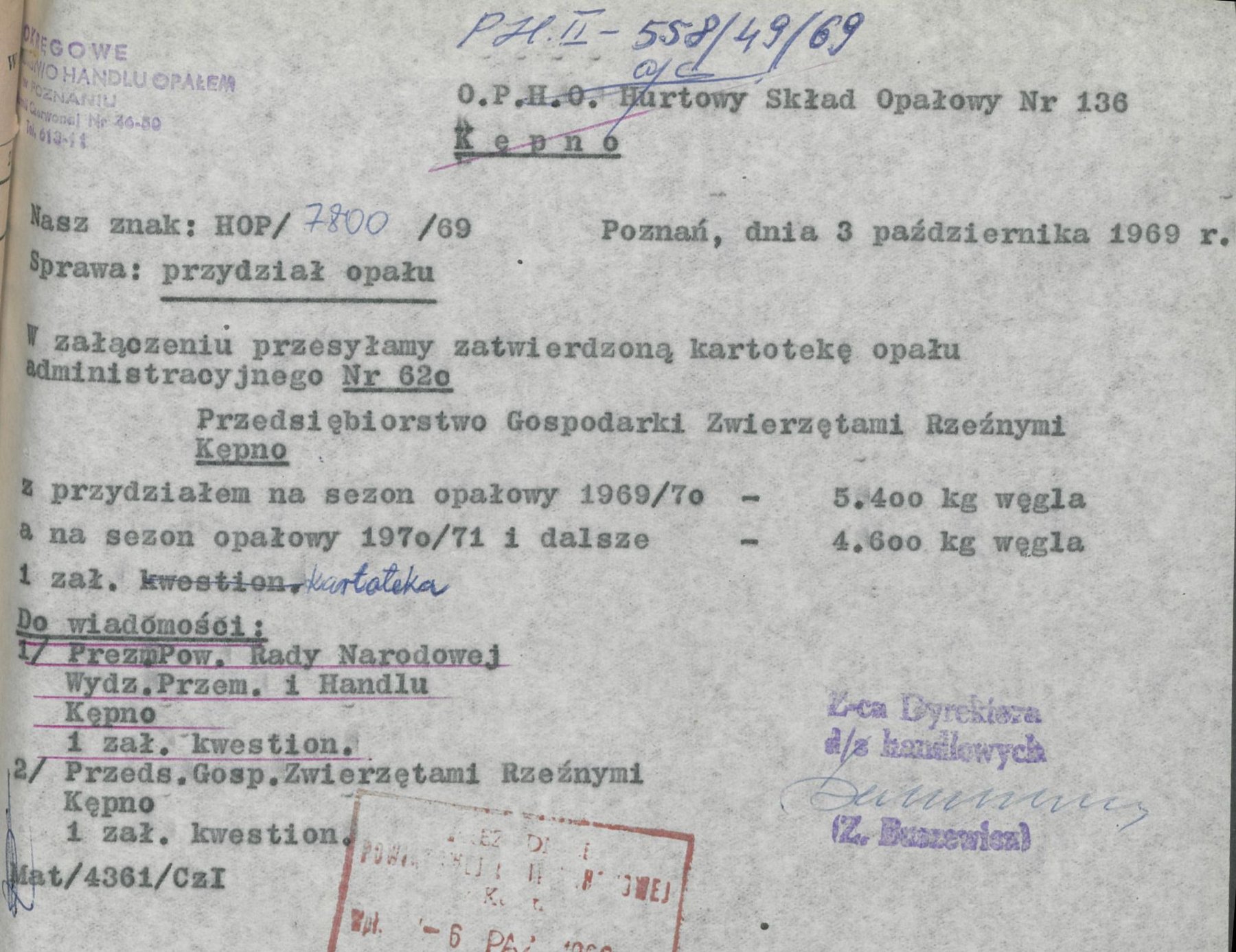 Pismo z 3 października 1969 r. informujące o przydziale opału dla Przedsiębiorstwa Gospodarki Zwierzętami Rzeźnymi w Kępnie na sezon opałowy 1969/1970 oraz 1970/1971.