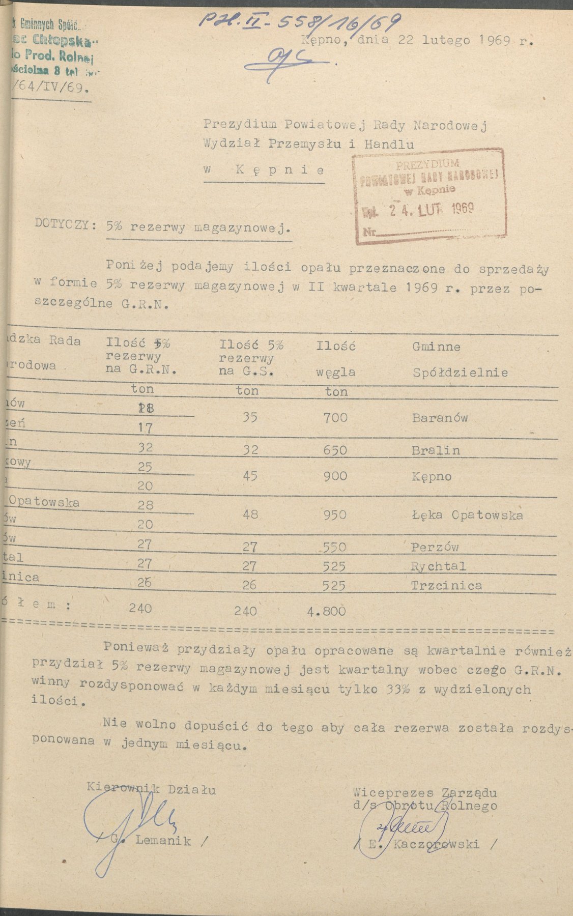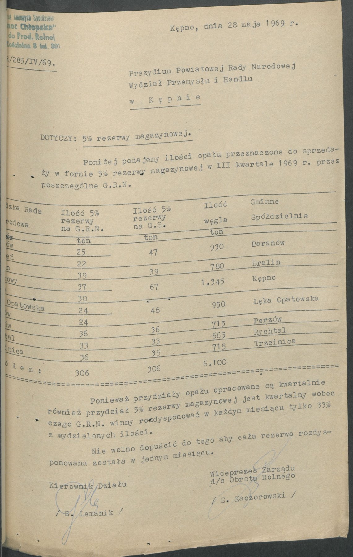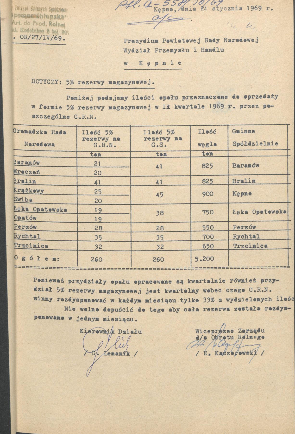 Pisma z 1969 r. informujące o ilości opału jaki przeznaczony był do sprzedaży w formie 5% rezerwy magazynowej w I, II oraz III kwartale 1969 r. przez poszczególne gromadzkie rady narodowe.