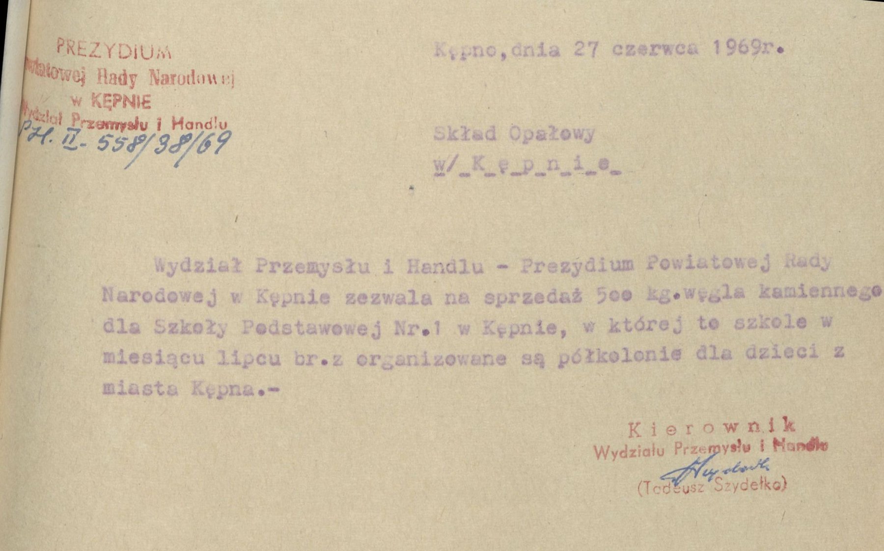 Pismo z 27 czerwca 1969 r. Wydziału Przemysłu i Handlu Prezydium Państwowej Rady Narodowej w Kępnie, zezwalające na sprzedaż 500 kg węgla kamiennego dla Szkoły Podstawowej Nr 1 w Kępnie, organizującej półkolonie dla dzieci.