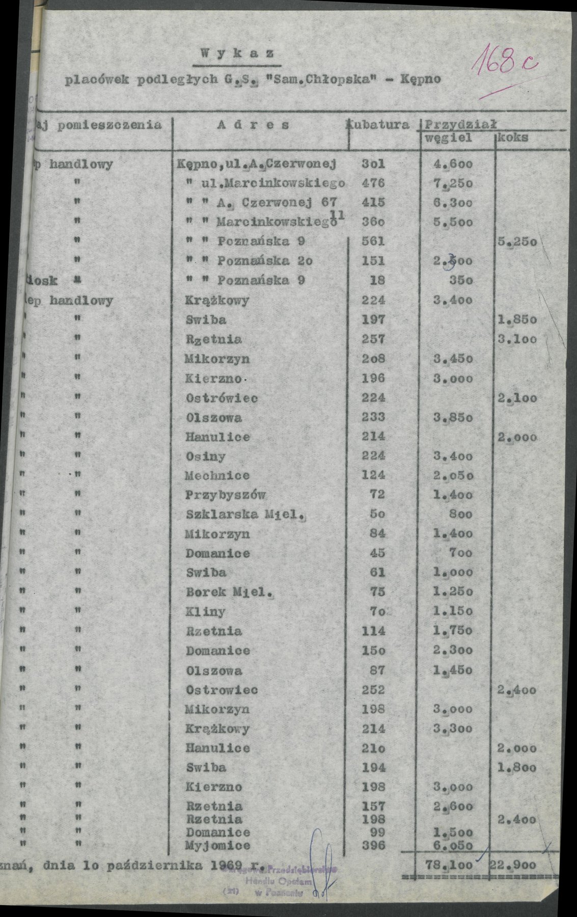 Pismo z 10 października 1969 r. dotyczące przydziału węgla i koksu dla placówek podległych Gminnej Spółdzielni " Samopomoc Chłopska" w Kępnie.