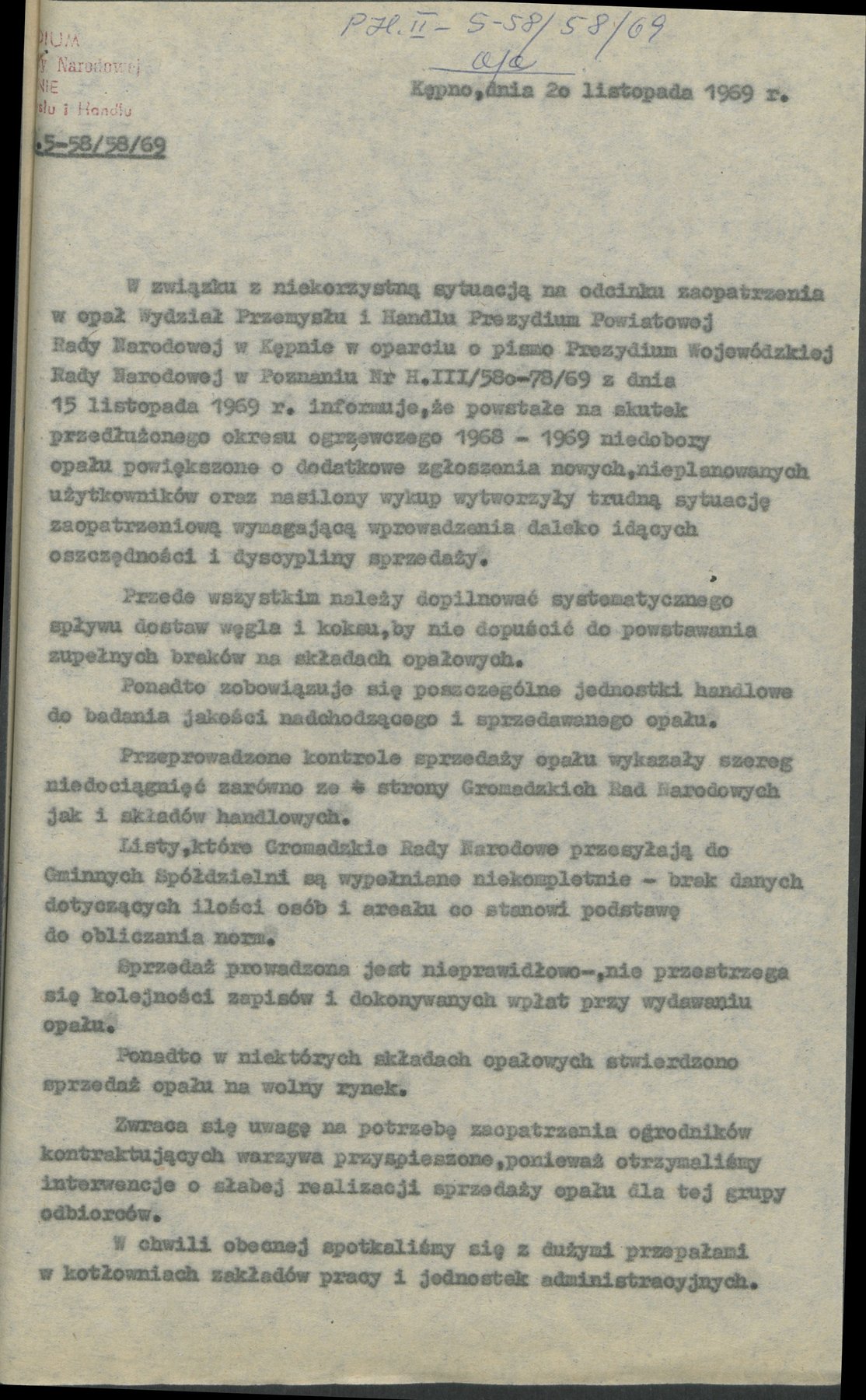 Pismo z 20 listopada 1969 r., Wydziału Przemysłu i Handlu PPRN w Kępnie dotyczące m.in. wytycznych w sprawie zaopatrzenia w opał, dyscypliny sprzedaży, a także spraw przewozu.
