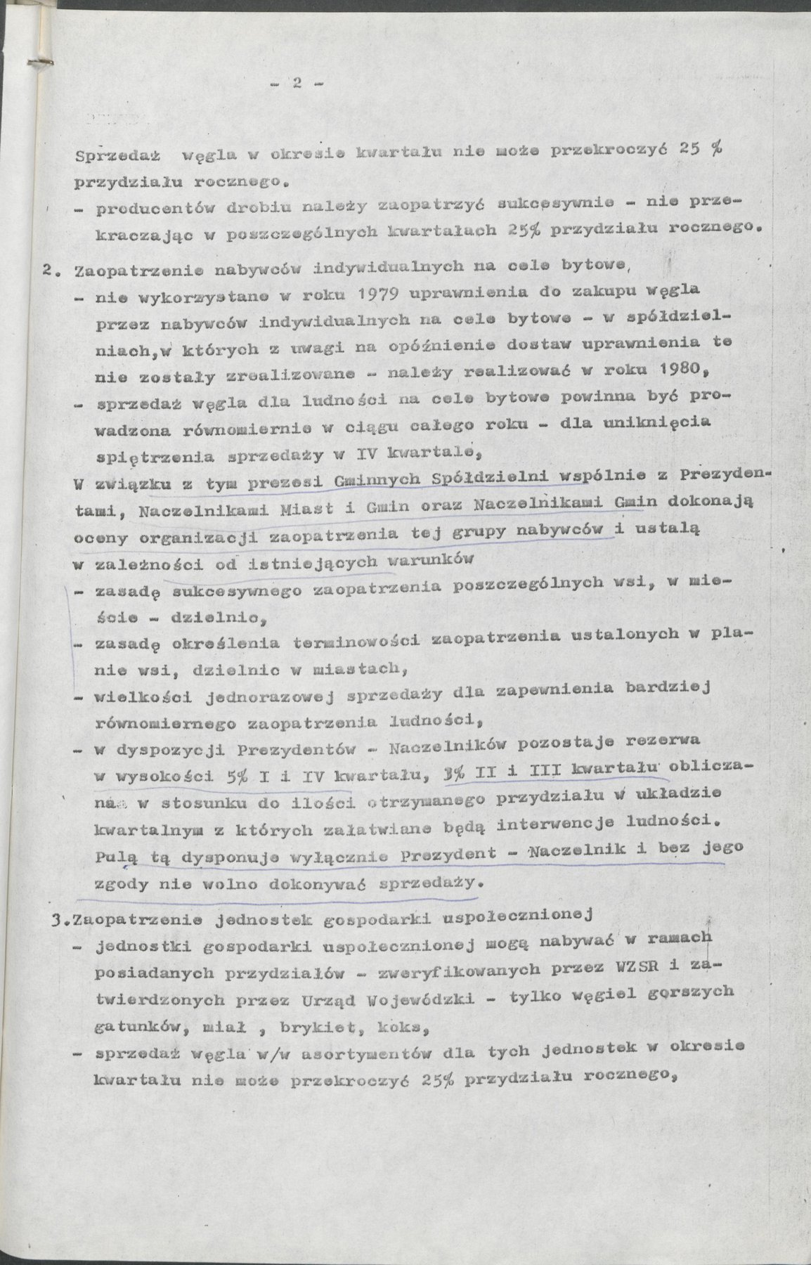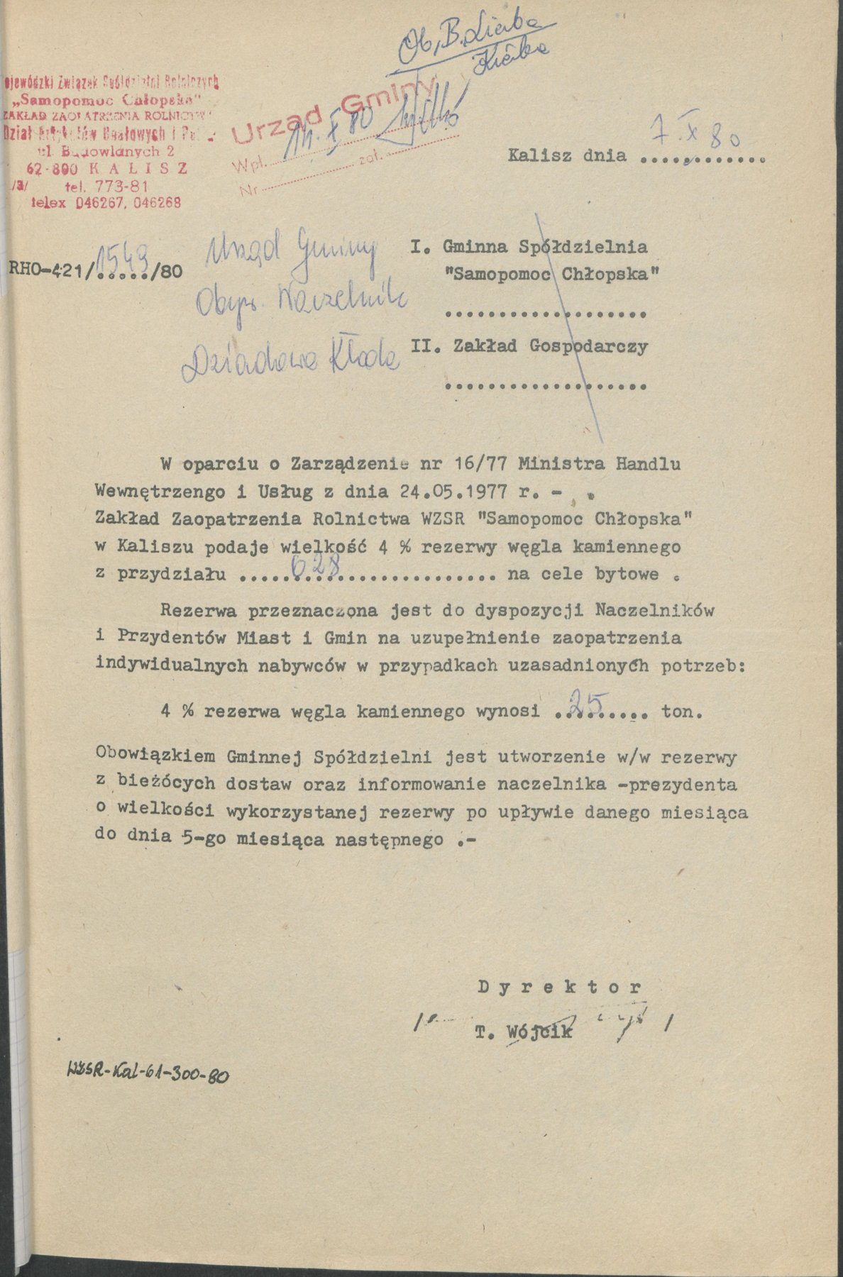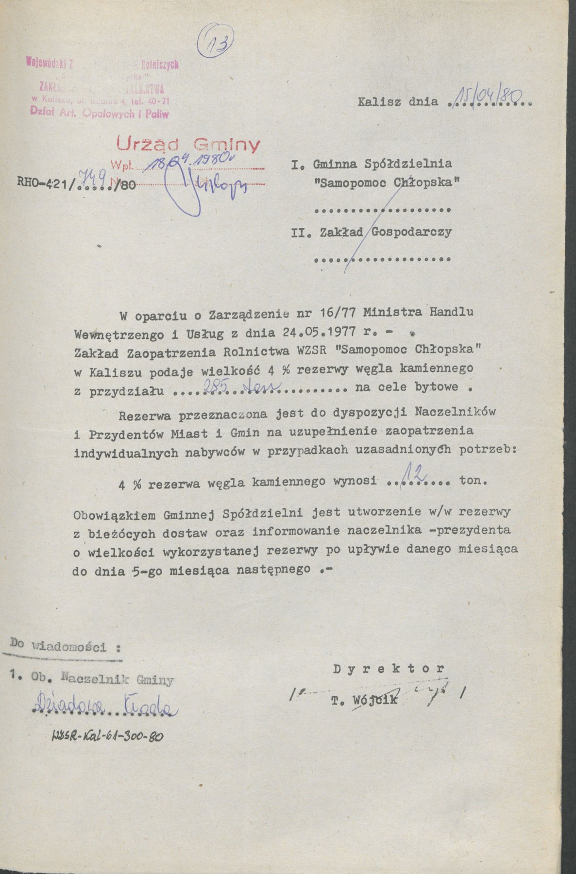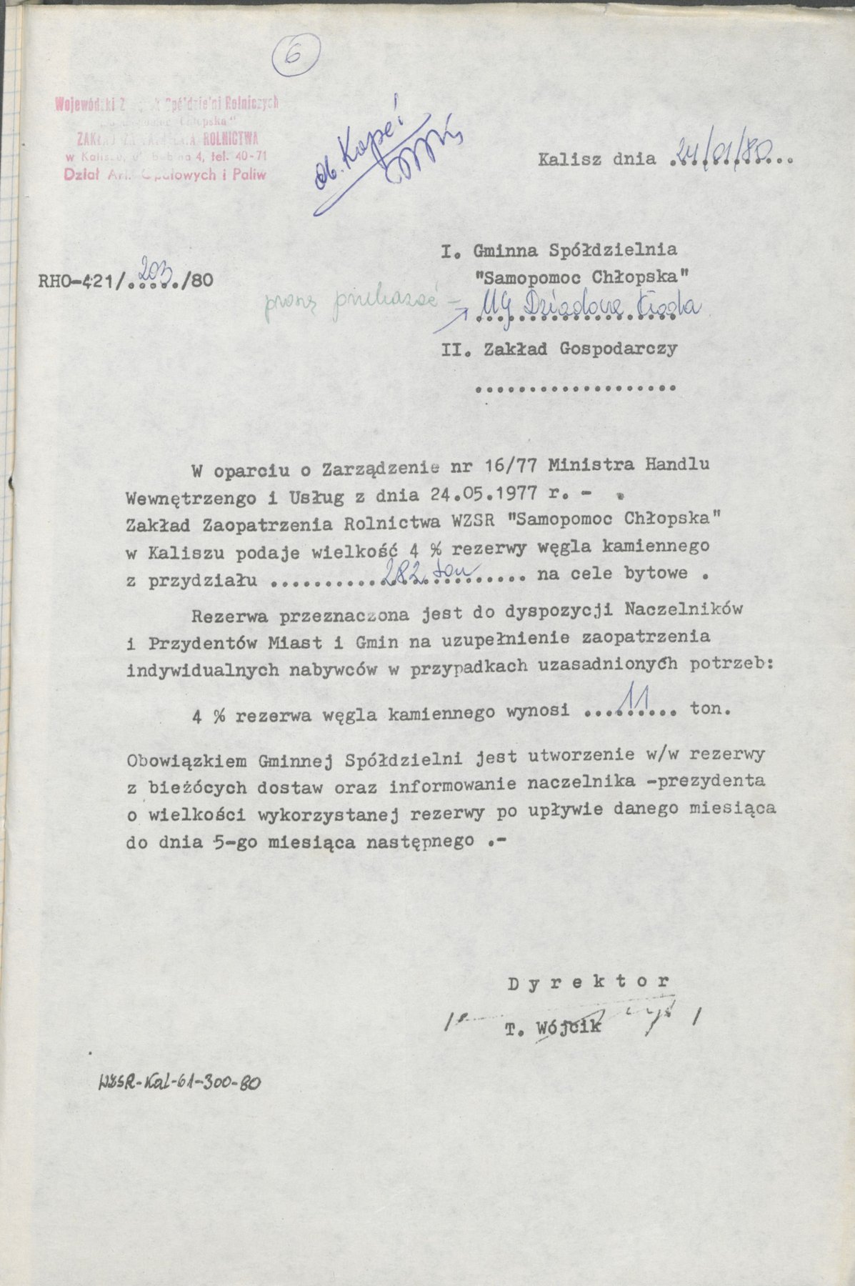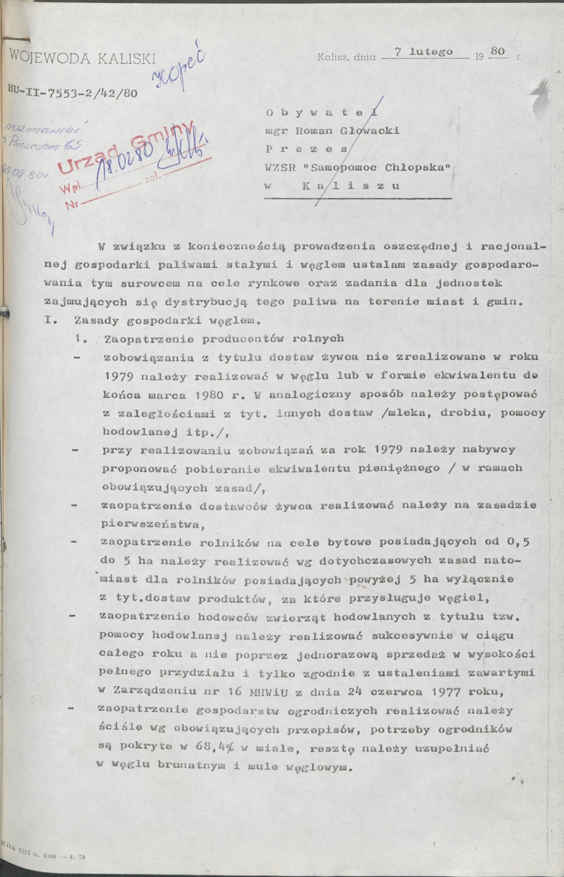 Pismo Wojewody Kaliskiego z 7 lutego 1980 r., wystosowane w związku z koniecznością prowadzenia oszczędnej i racjonalnej gospodarki paliwami stałymi i węglem. Ustalono zasady gospodarowania tym surowcem do celów rynkowych oraz zadania dla jednostek, które zajmowały się dystrybucją paliw na terenie miast i gmin. Zasady obejmowały zaopatrzenie w opał producentów rolnych, nabywców indywidualnych oraz jednostki gospodarki uspołecznionej.