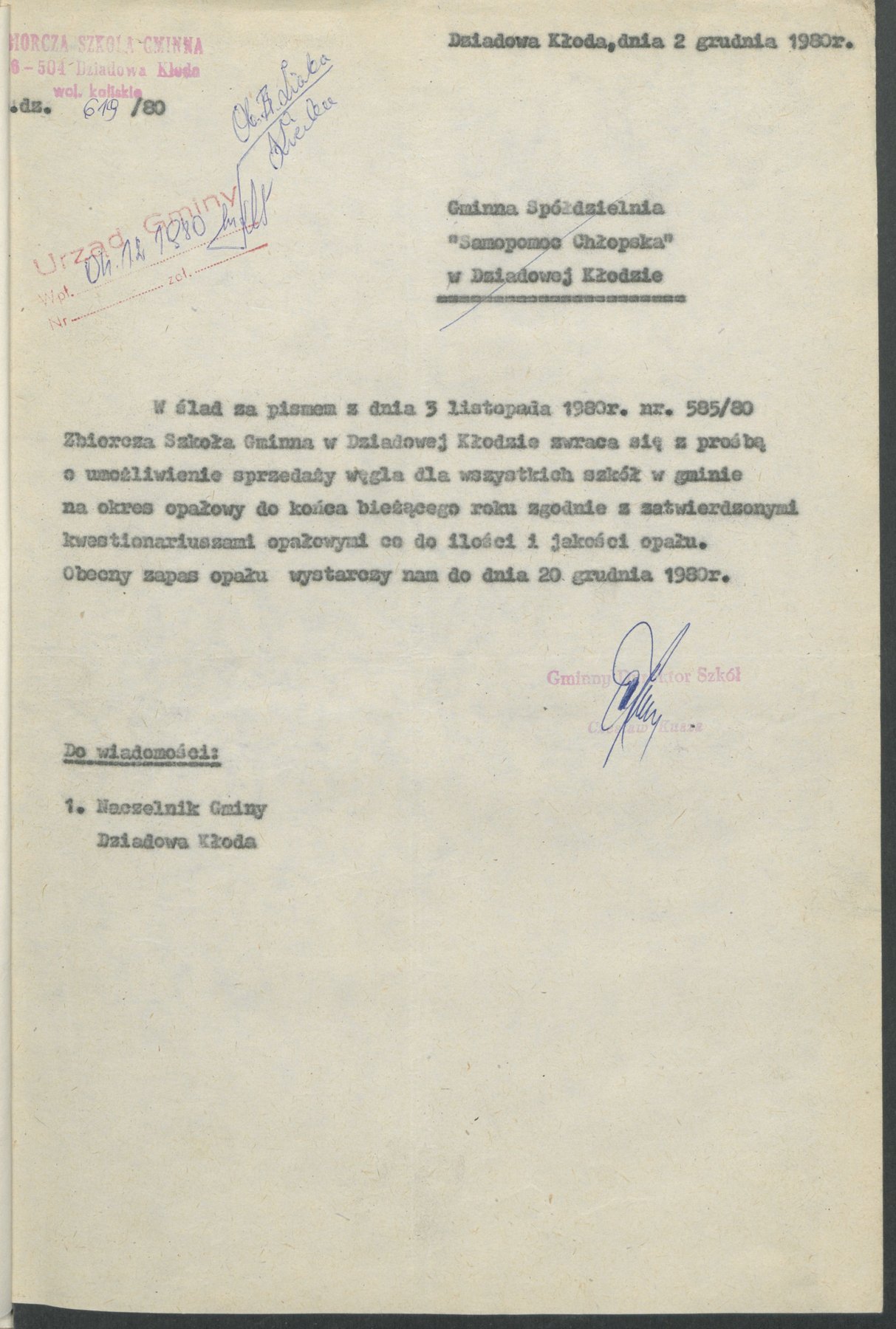 Pismo z 2 grudnia 1980 r., wystosowane przez Zbiorczą Szkołę Gminną w Dziadowej Kłodzie, z prośbą o umożliwienie sprzedaży węgla dla wszystkich szkół w gminie, zgodnie z zatwierdzonymi kwestionariuszami opałowymi co do ilości i jakości opału.