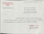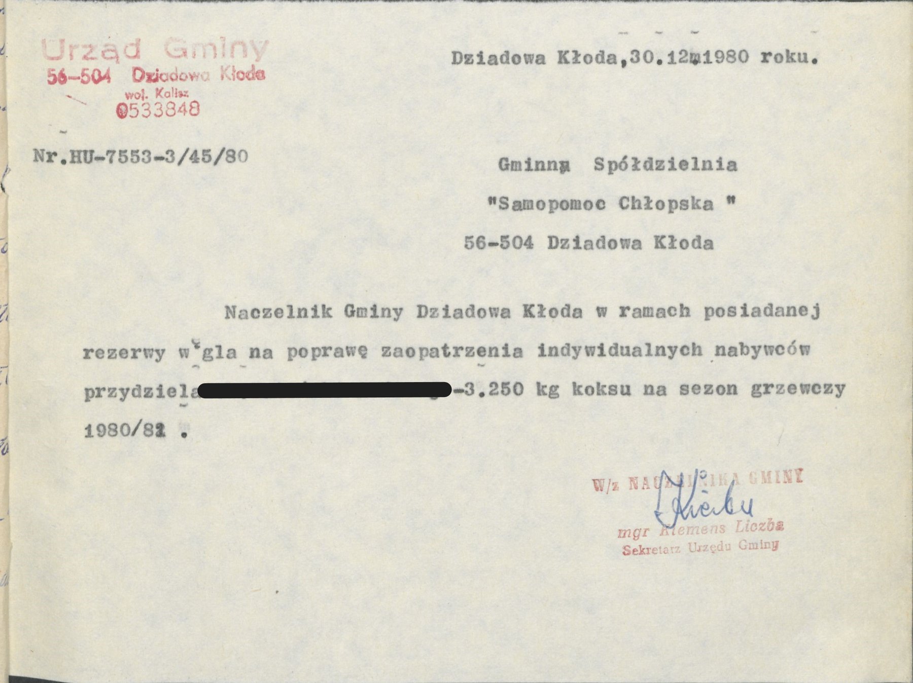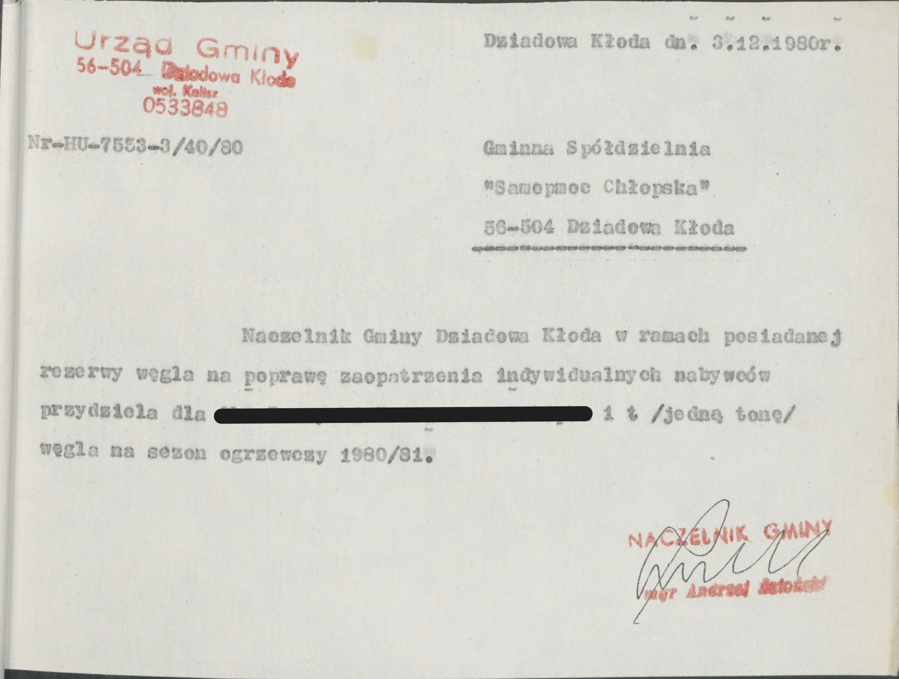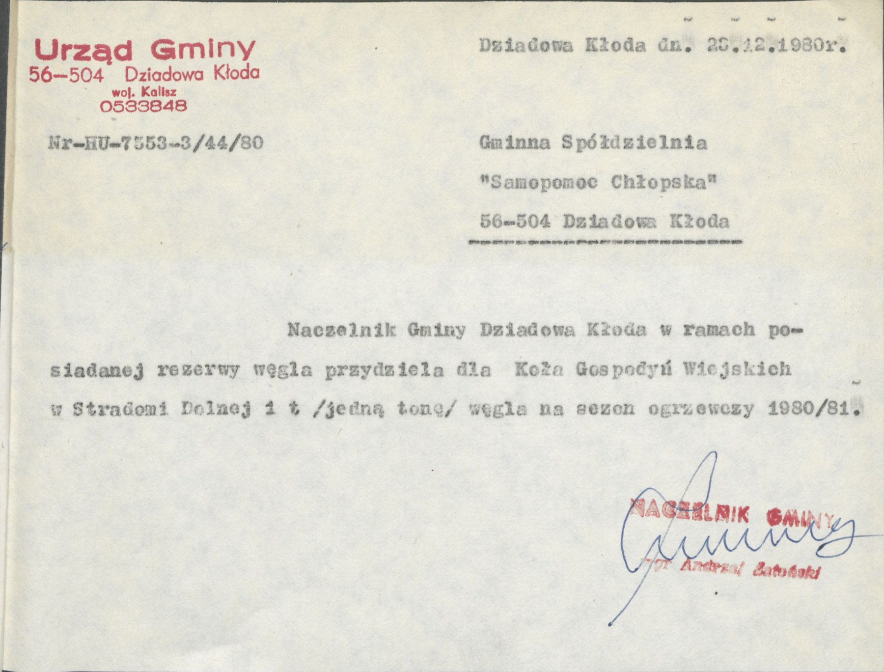 Pismo z 28 grudnia 1980 r. Naczelnika Gminy Dziadowa Kłoda informujące o przydziale w ramach posiadanej rezerwy węgla na sezon grzewczy 1980/1981 w ilości 1 tony dla Koła Gospodyń Wiejskich w Stradomi Dolnej.