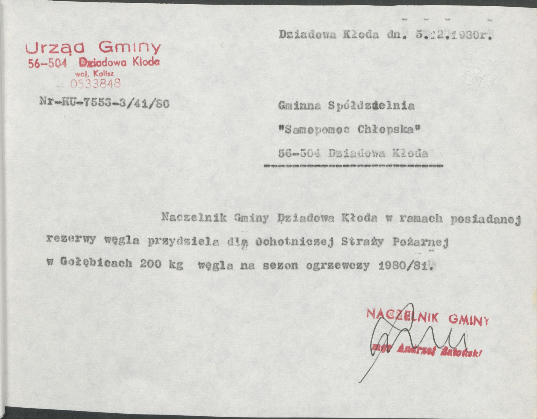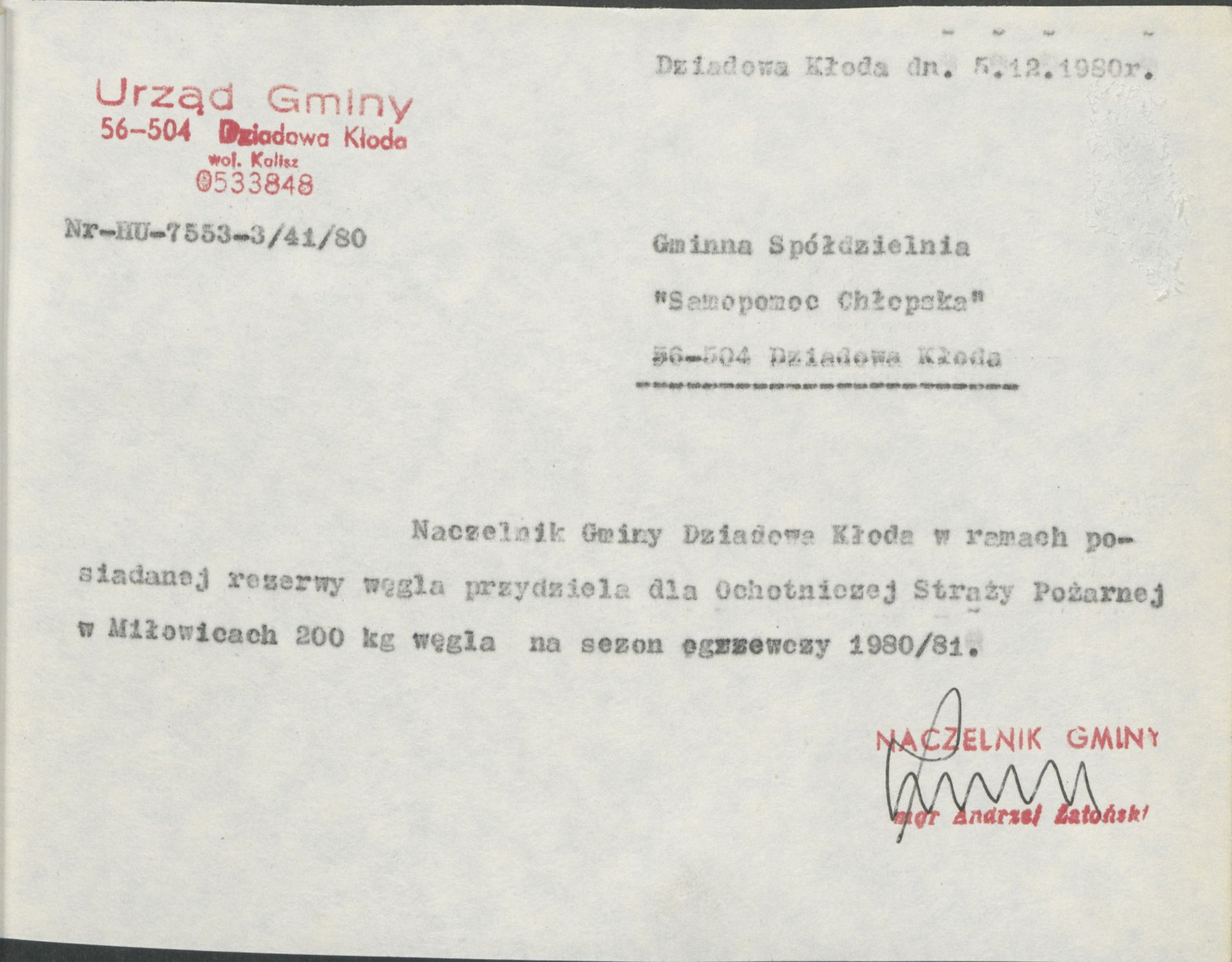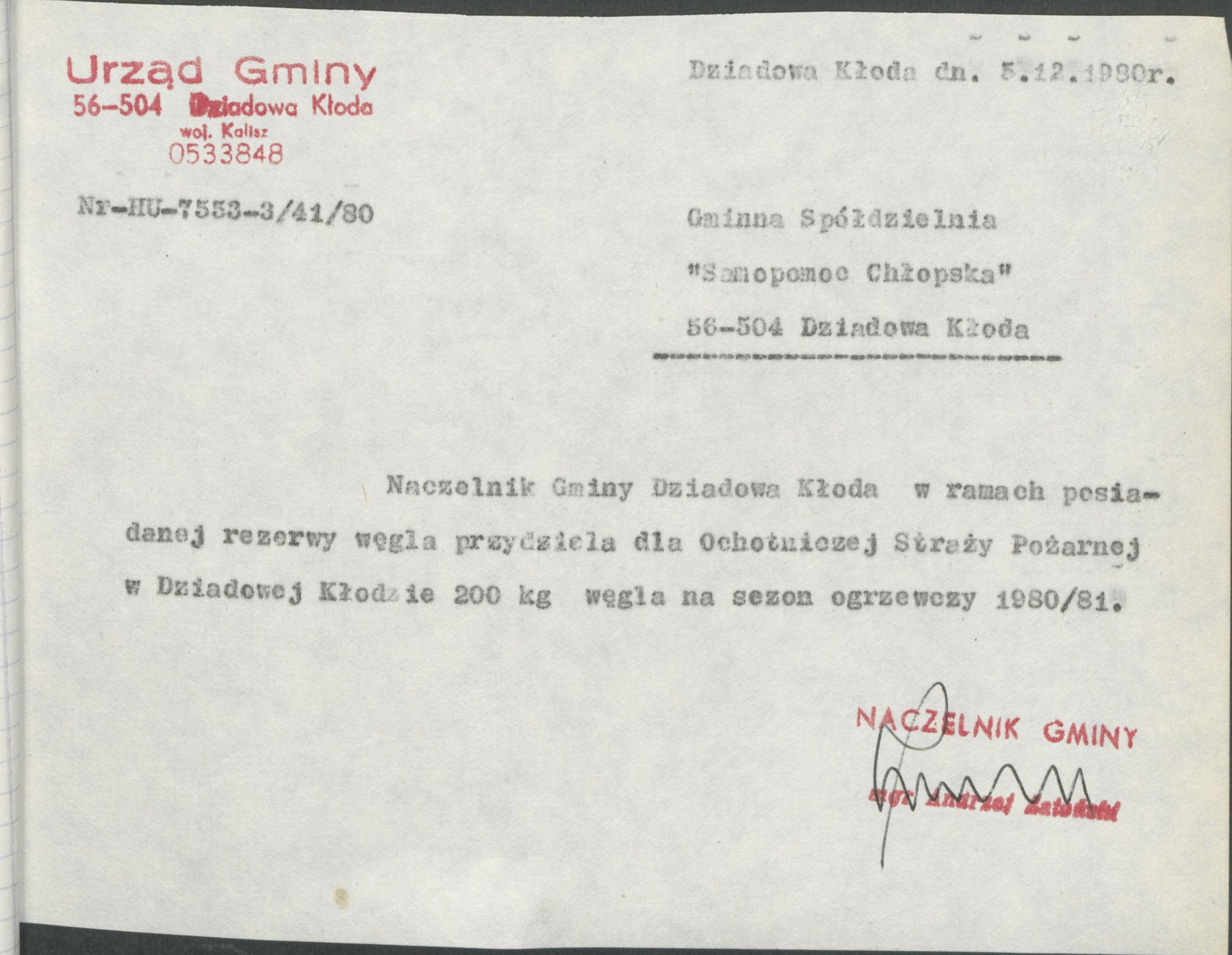 Pisma z 5 grudnia 1980 r. Naczelnika Gminy Dziadowa Kłoda, informujące o przydziale w ramach posiadanej rezerwy węgla na sezon grzewczy 1980/81 w ilości 200 kg dla Ochotniczej Straży Pożarnej w Dziadowej Kłodzie, Miłowicach, Dalborowicach, Dziadowym Moście, Gołębicach oraz Lipce.