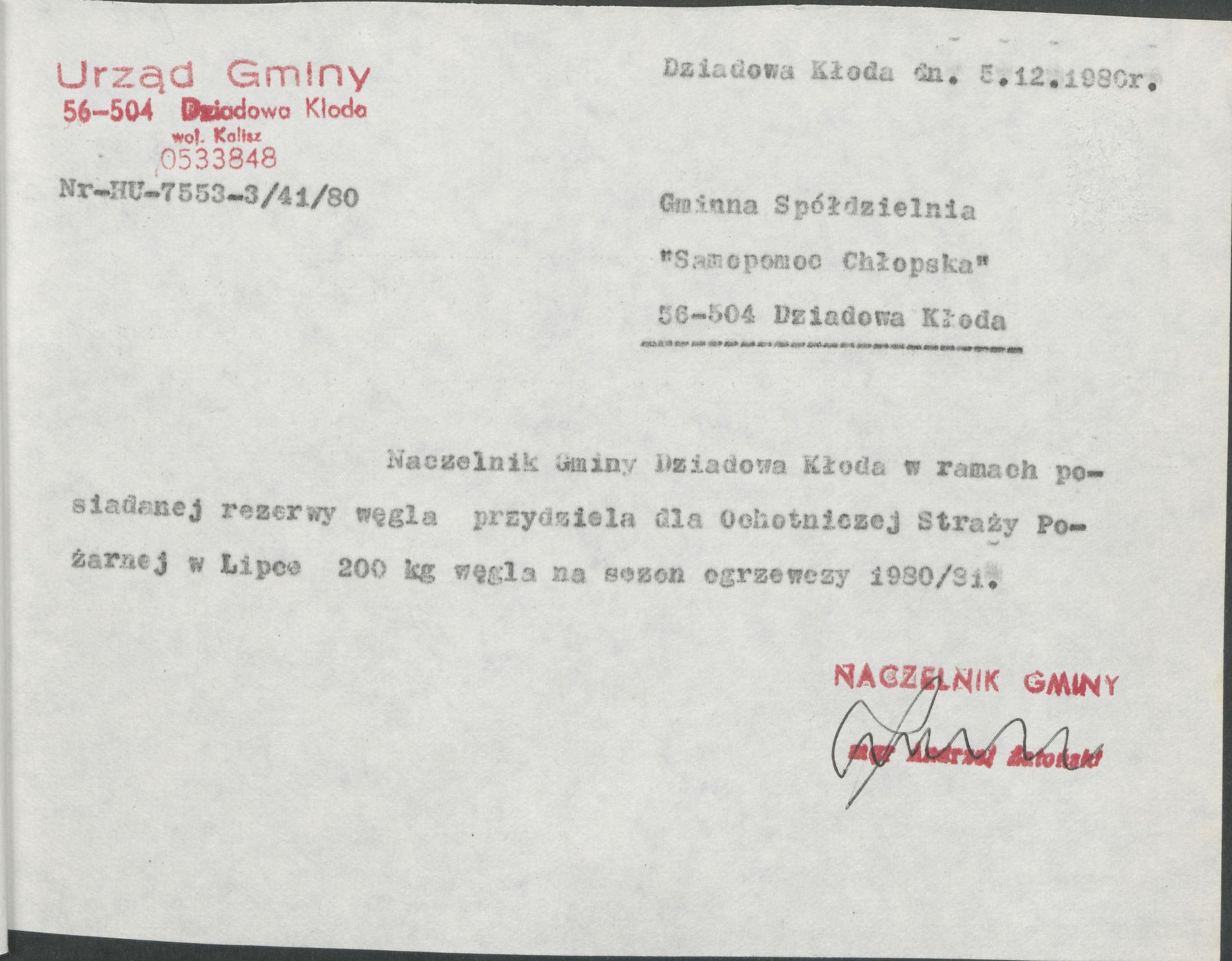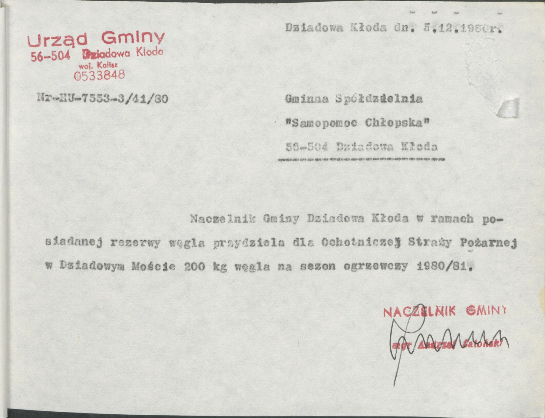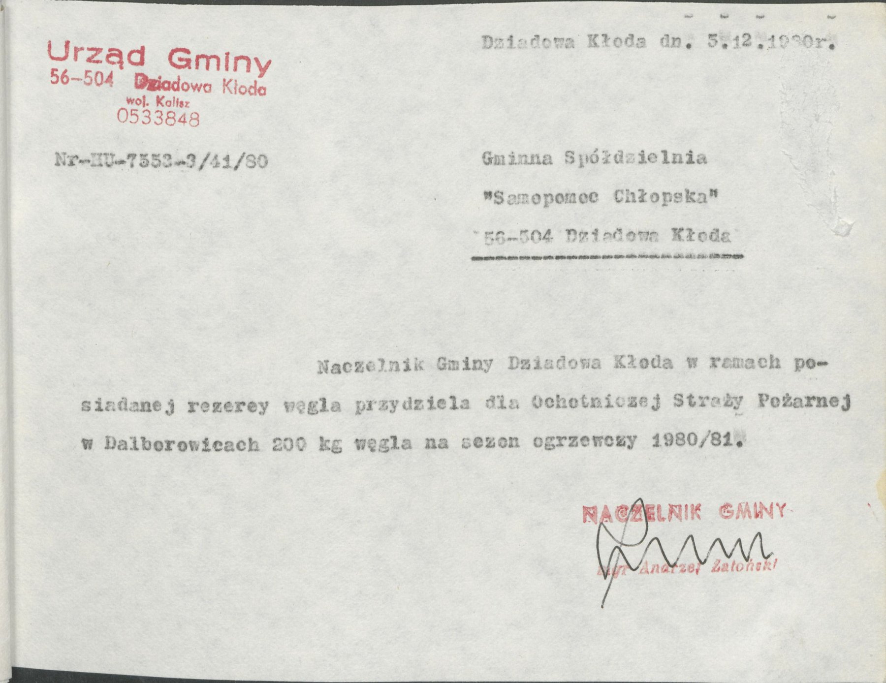 Pisma z 5 grudnia 1980 r. Naczelnika Gminy Dziadowa Kłoda, informujące o przydziale w ramach posiadanej rezerwy węgla na sezon grzewczy 1980/81 w ilości 200 kg dla Ochotniczej Straży Pożarnej w Dziadowej Kłodzie, Miłowicach, Dalborowicach, Dziadowym Moście, Gołębicach oraz Lipce.