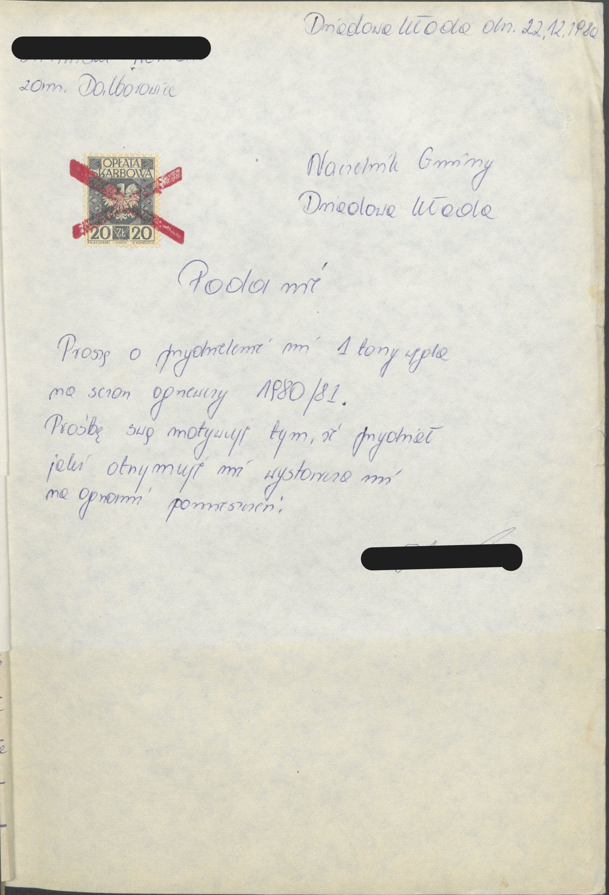 Podanie z 22 grudnia 1980 r. do Naczelnika Gminy Dziadowa Kłoda od mieszkańca Dalborowic, z prośbą o przydzielenie 1 tony węgla na sezon grzewczy 1980/1981 , gdyż dotychczasowy przydział okazał się niewystarczający.