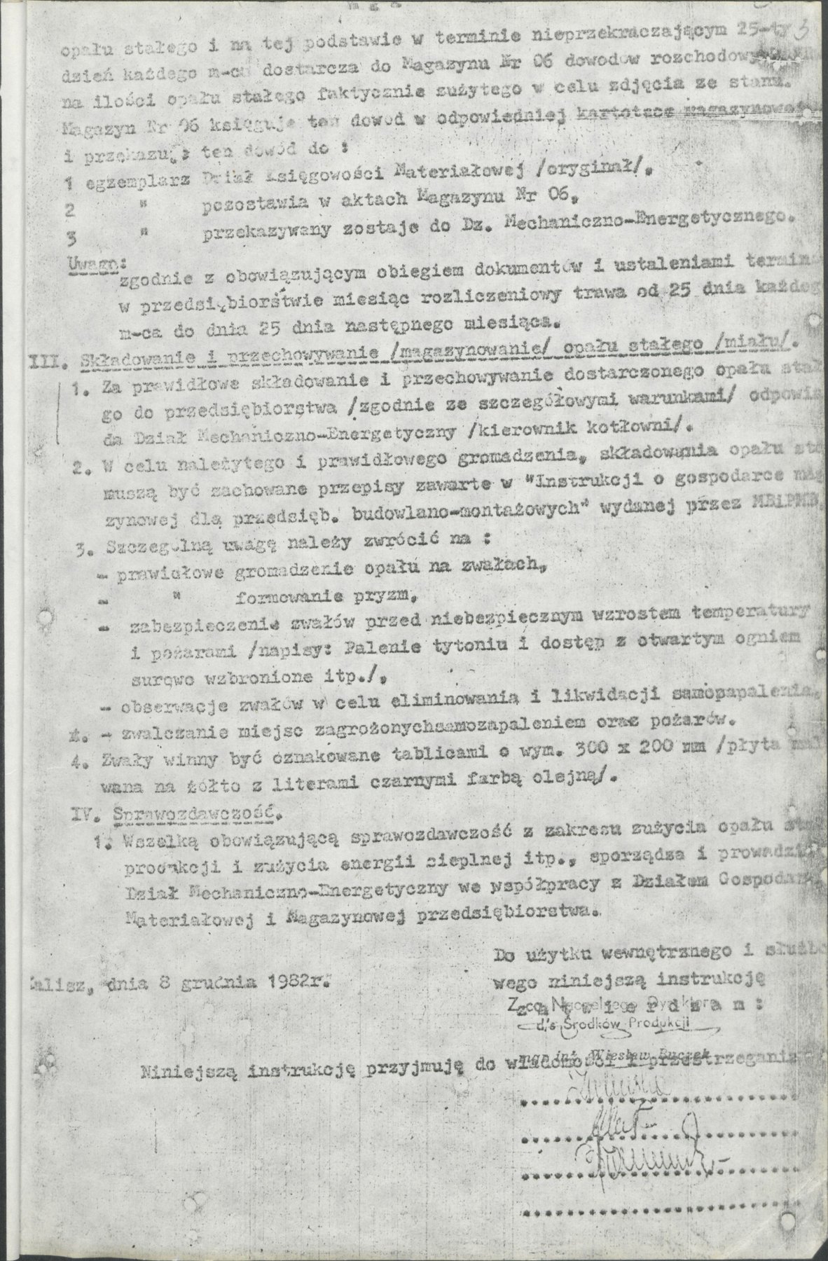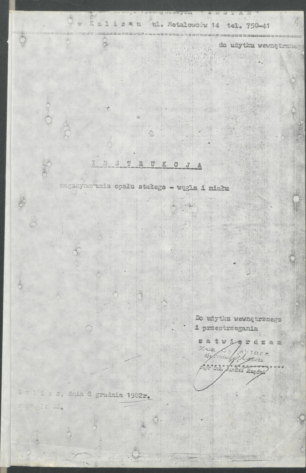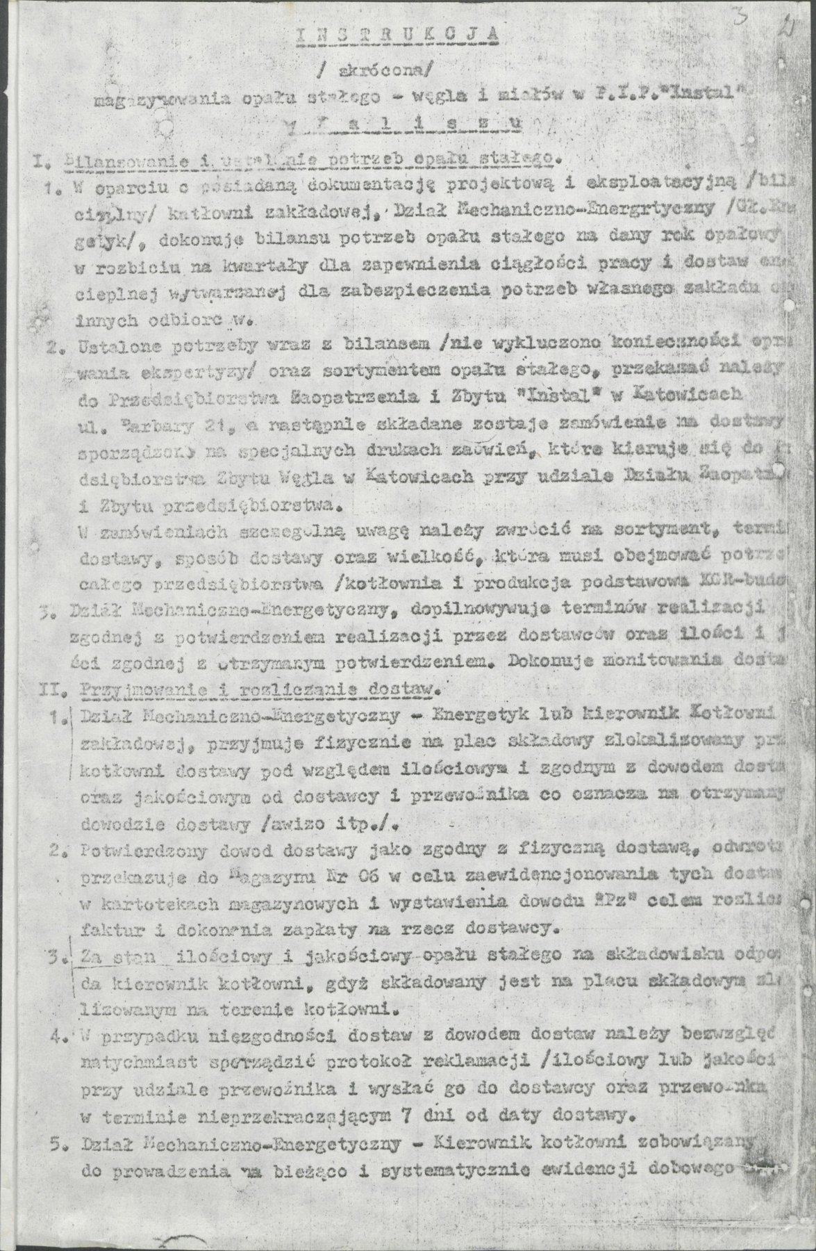 Instrukcja magazynowania opału stałego (węgla i miału) przez Przedsiębiorstwo Instalacji Przemysłowych "Instal" w Kaliszu z 8 grudnia 1982 r. Instrukcja dotyczyła bilansowania i ustalania potrzeb na opał stały, przyjmowania i rozliczania dostaw, składowania i przechowywania (magazynowania) opału stałego oraz sprawozdawczość.