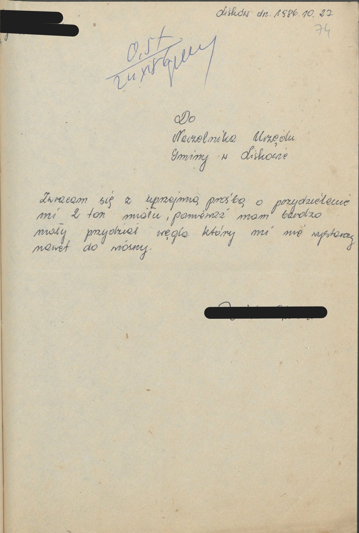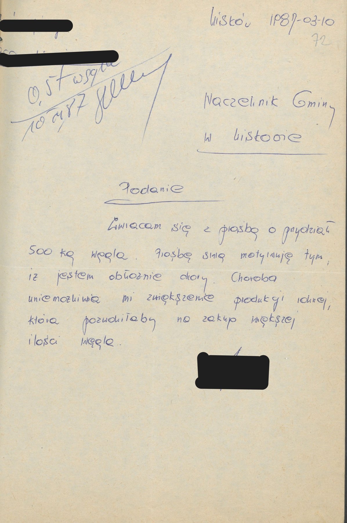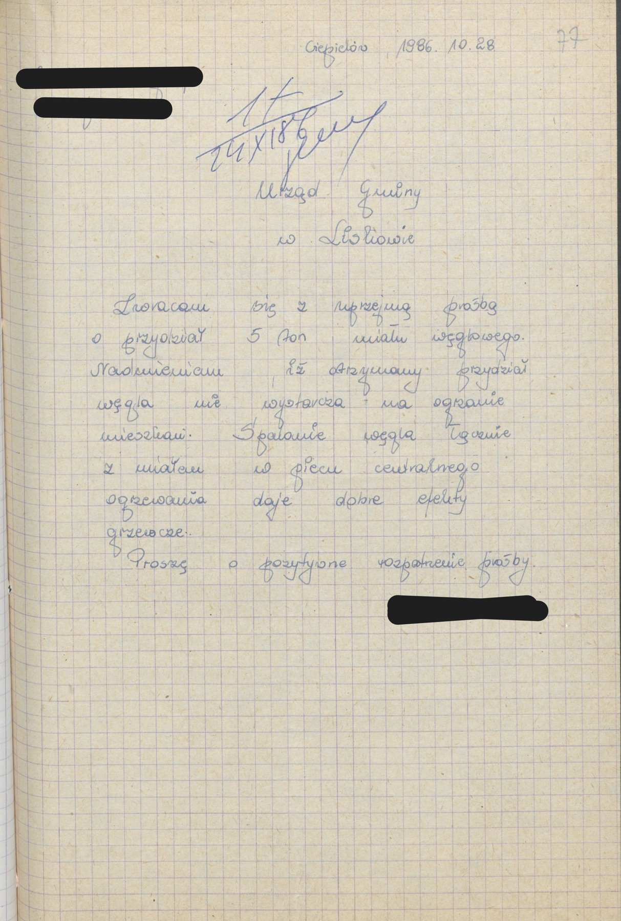 Podania osób indywidualnych do Naczelnika Gminy w Liskowie z 1986 i 1987 r. w sprawie przydziału węgla.
