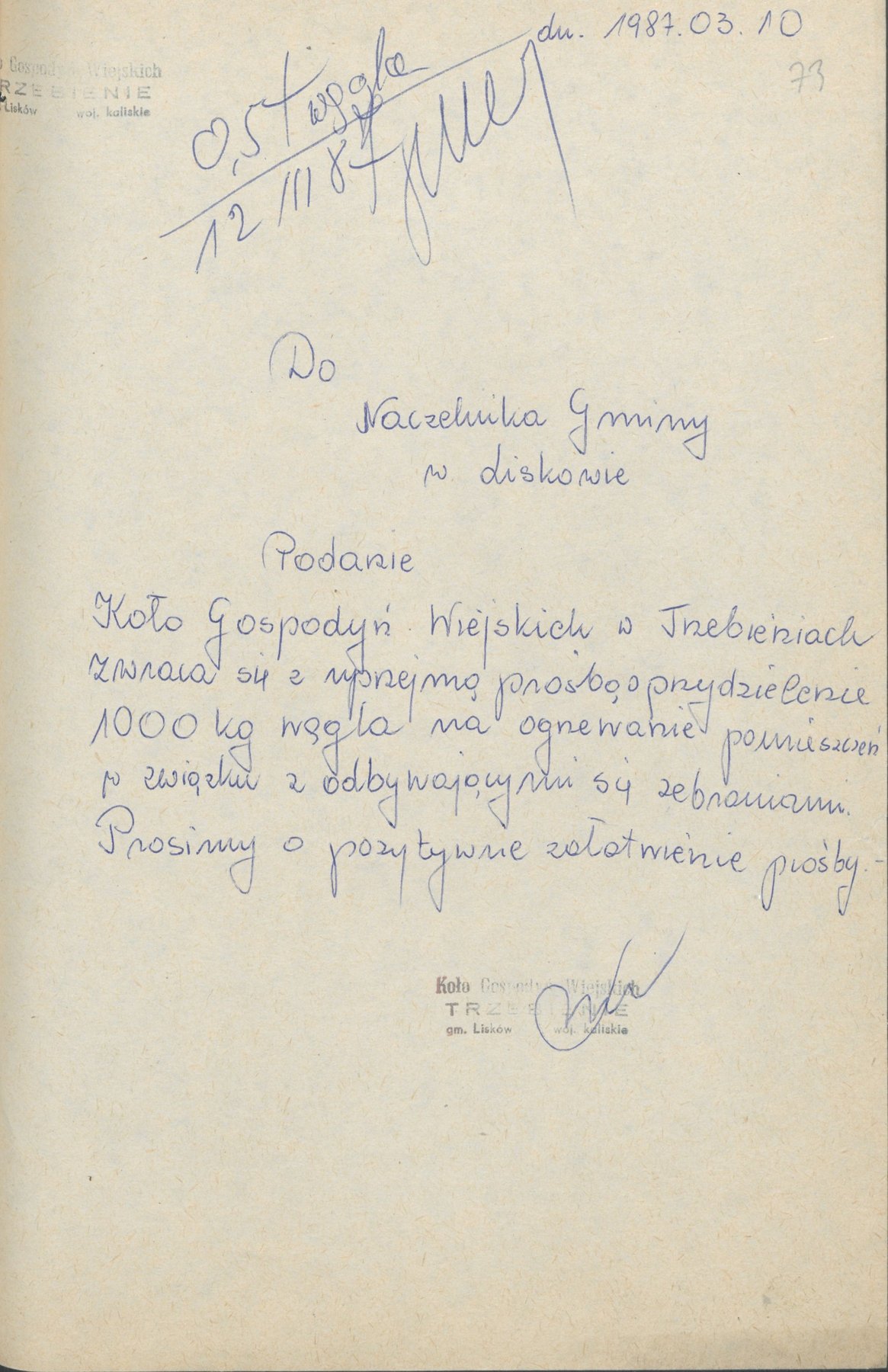 Podanie Koła Gospodyń Wiejskich w Trzebieniach do Naczelnika Gminy w Liskowie z 10 marca 1987 r. w sprawie przydziału węgla.