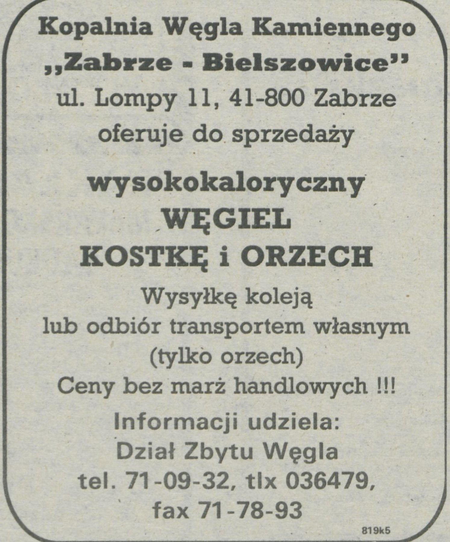 Ogłoszenie z 8 listopada 1991 r., które ukazało się w 45. numerze "Ziemi Kaliskiej", dotyczące sprzedaży opału przez Kopalnię Węgla Kamiennego "Zabrze - Bielszowice" w Zabrzu. Kopalnia oferowała w swojej sprzedaży wysokokaloryczny węgiel kostkę oraz orzech.